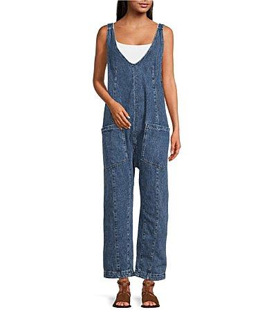 One-and-done and so simple, this denim jumpsuit from our We The Freettttttttttttttttttttttttt Collection is featured in a relaxed fit and cropped ankle-length style with harem legs and a low scoop neckline. **Fit:** Slouchy, relaxed fit; ankle-length, pull-on style **Features:** Denim fabrication, rigid feel, low scoop neckline, seam detail throughout, oversized patch pockets, drop-crotch harem-style legs, low back with adjustable shoulder straps **Why We