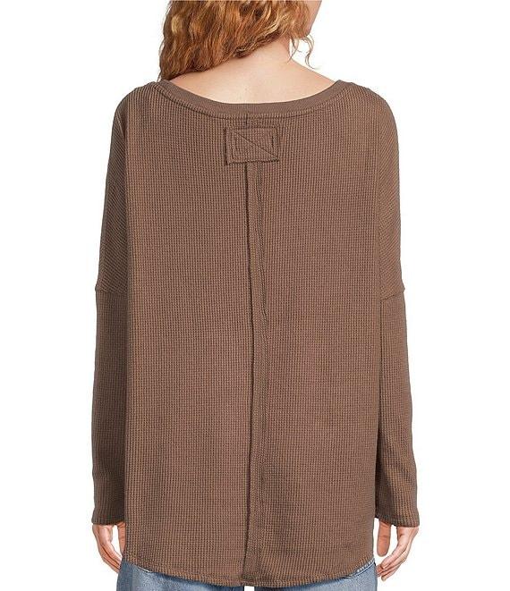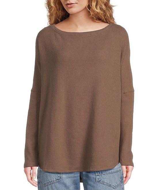 Free People Latte Blues Thermal Boat Neck Long Sleeve Waffle Knit Top