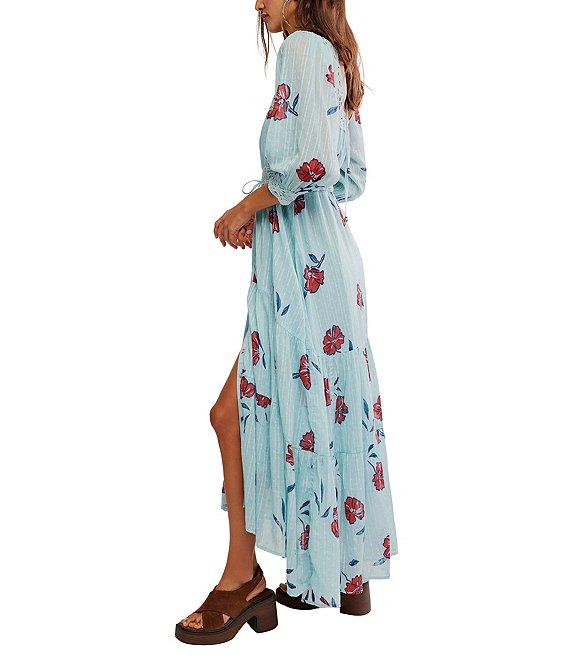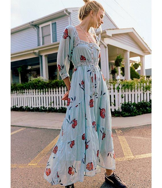 From Free People, this dress features: Floral print Square neckline 3/4 sleeves Button front closure A-line silhouette Tie waist detail Back tie detail Lace detailing Lined Approx. 49.25" length Self: Cotton Lining: Cotton Machine wash cold Imported.