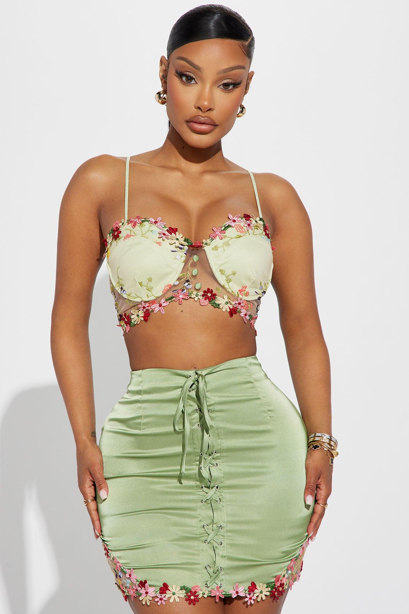Available In Green. Skirt Set Adjustable Spaghetti Strap Underwire Cups Flower Applique Mesh Detail Cropped Lace Up Detail Slight Stretch Hidden Side Zipper Disclaimer: Pattern Placement May Vary Shell/Bottom: 97% Polyester 3% Spandex Lining: 100% Polyester Imported