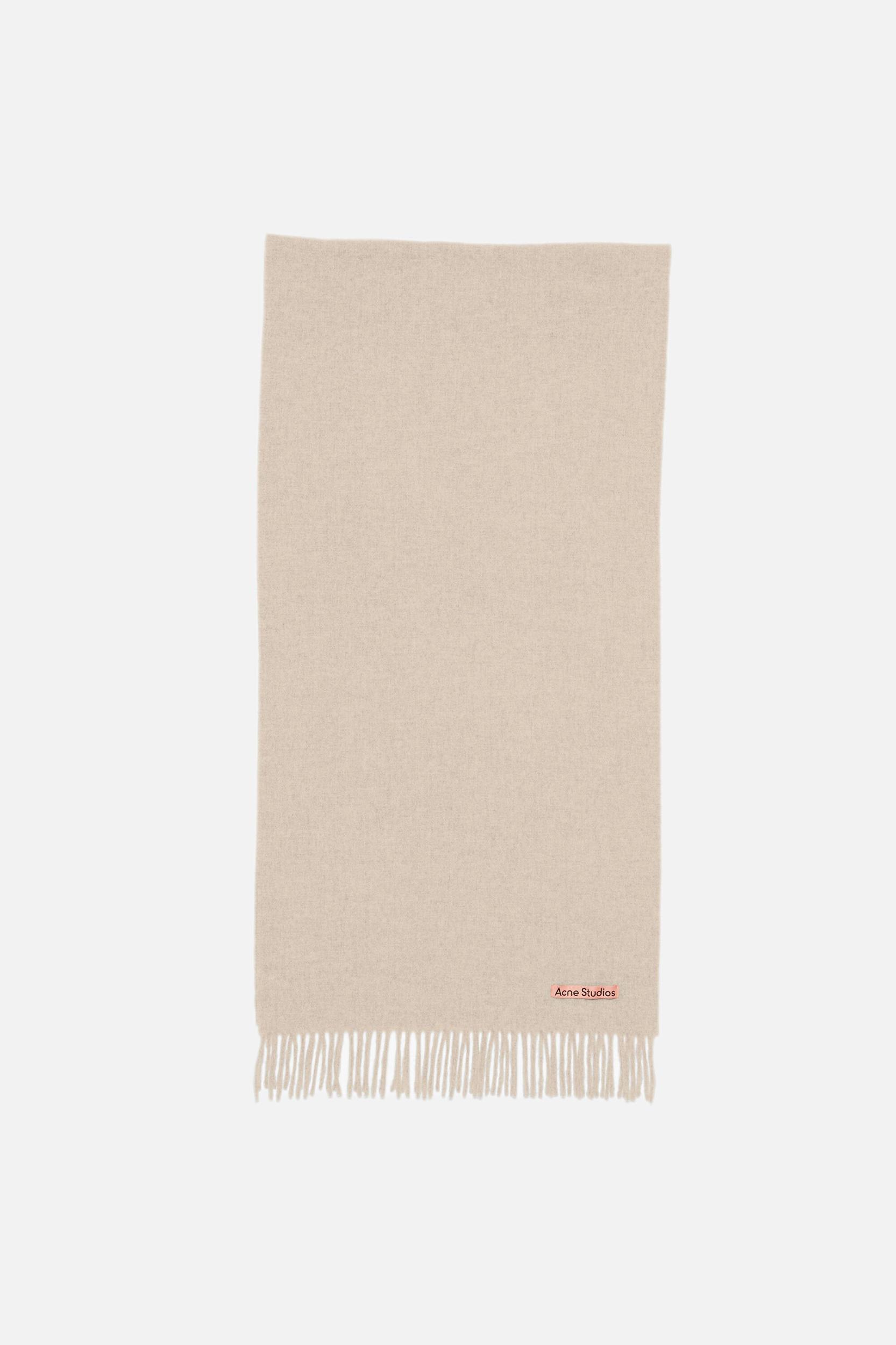 Acne Studios oatmeal melange fringed scarf is detailed with a pink Acne Studios label and crafted from midweight wool. FN-UX-SCAR000218