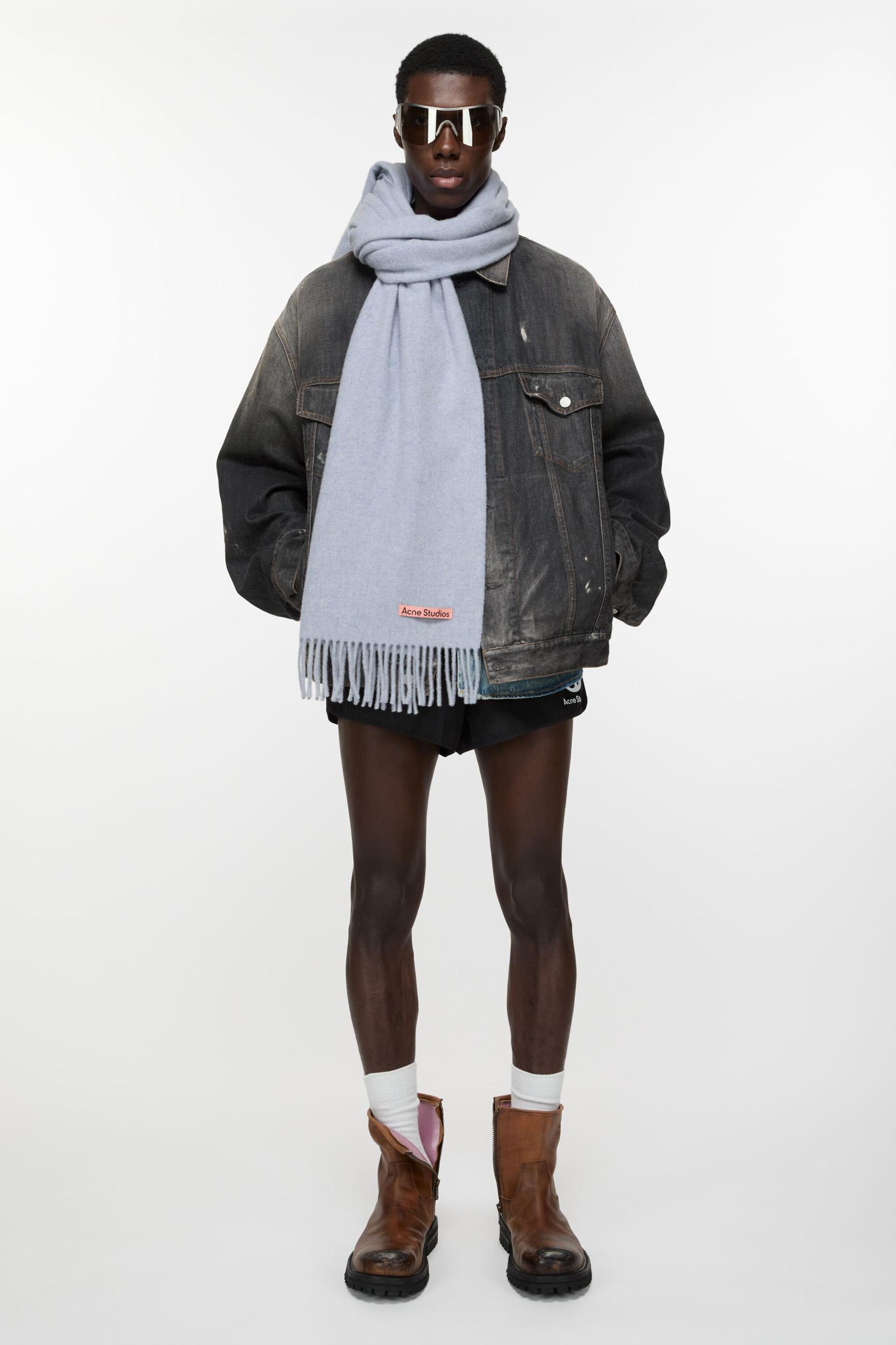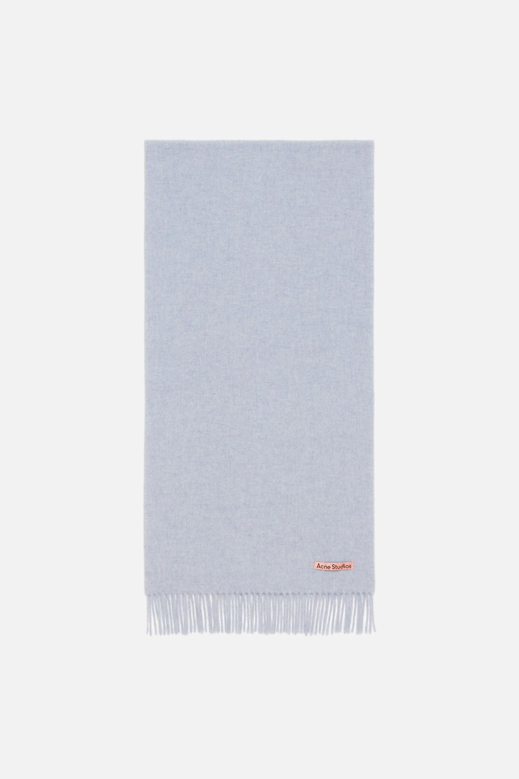 Acne Studios powder blue melange fringed scarf is detailed with a pink Acne Studios label and crafted from midweight wool. FN-UX-SCAR000218
