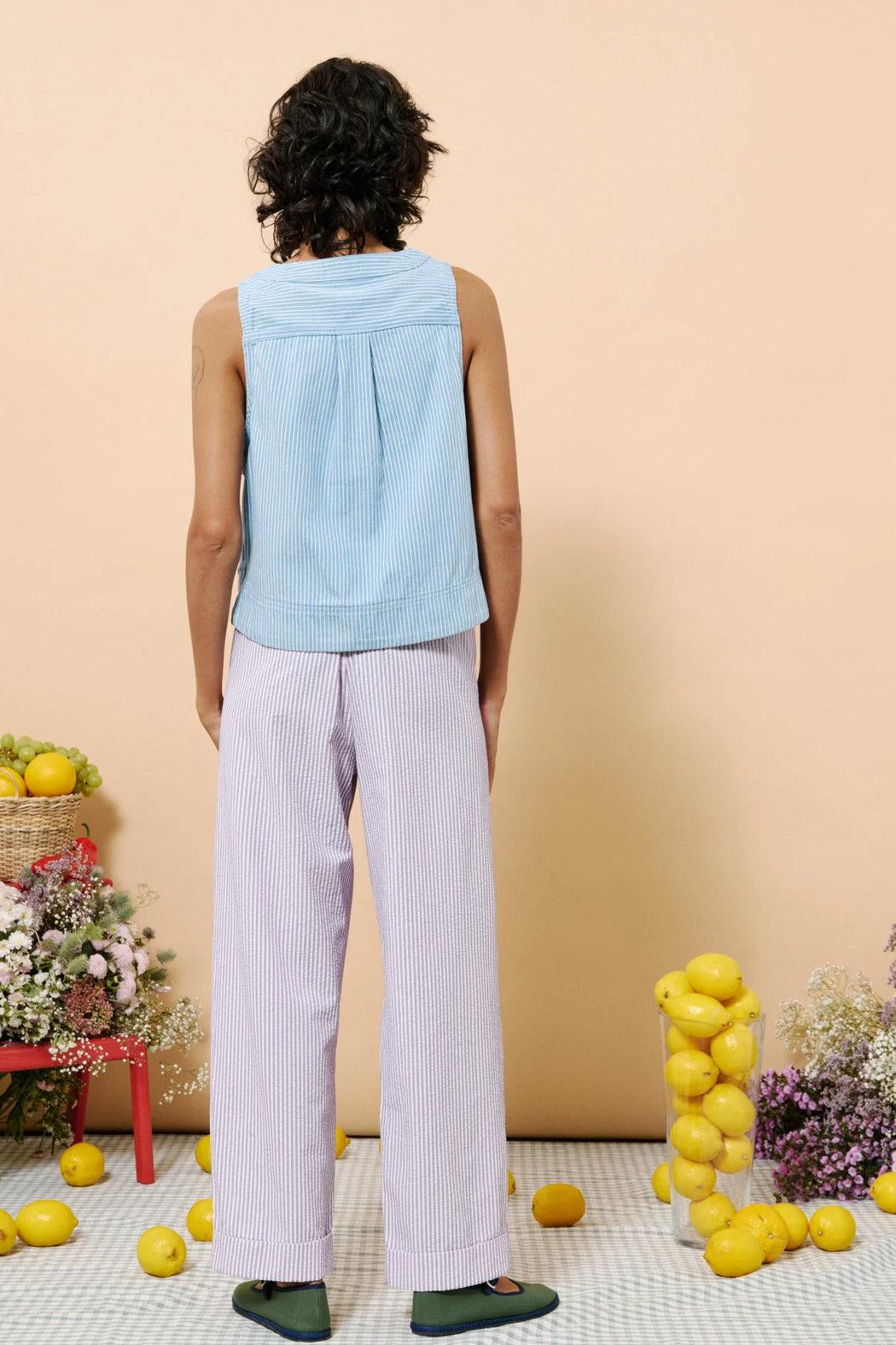 Add a touch of effortless style to your look with this sleeveless vest, crafted from lightweight striped cotton fabric for a fresh, breathable feel. Its cropped silhouette and single side pocket offer a modern, minimalist vibe—perfect for layering over your favorite summer pieces. Ideal for casual outings or a smart twist on everyday wear.