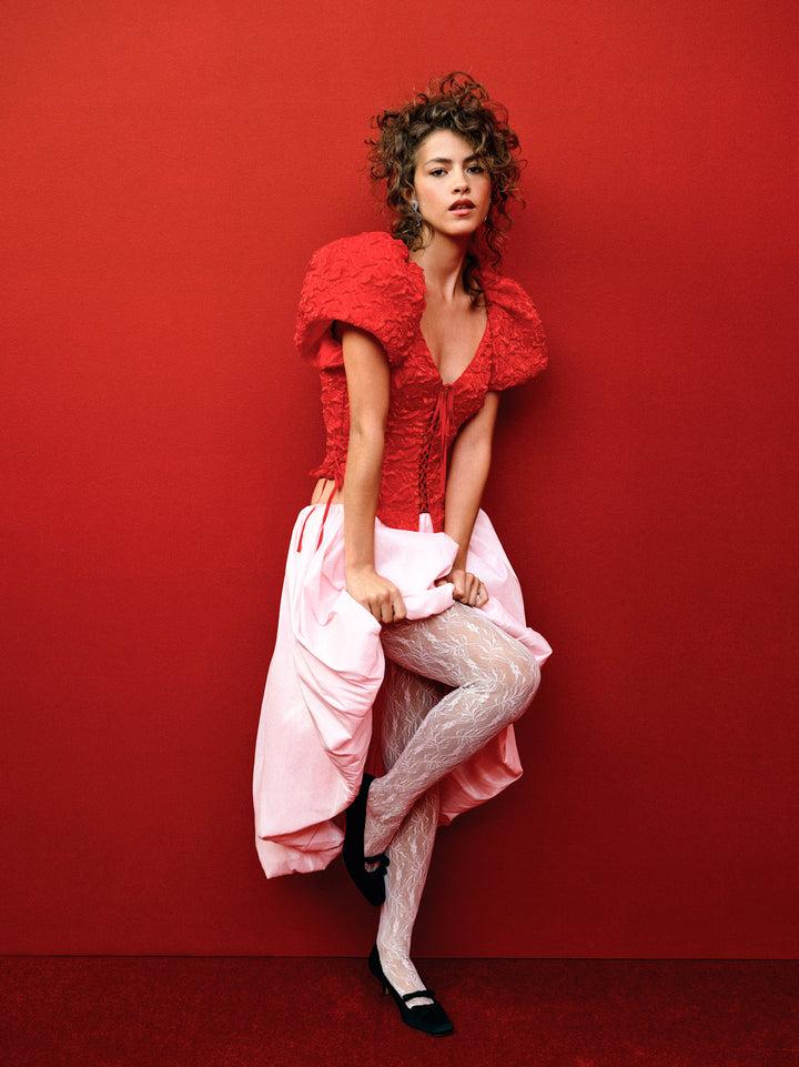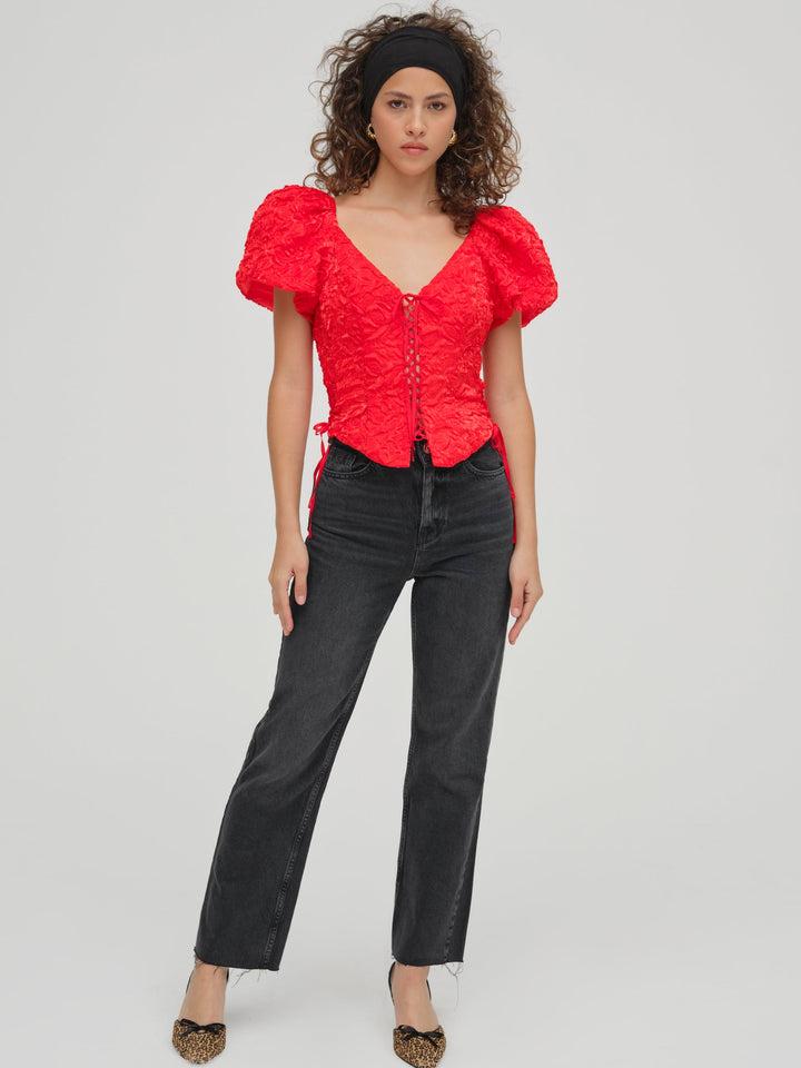 This Frosted Organza cream top is the perfect piece for the season's festive dinners. Crafted in a beautiful textured organza, this puff sleeve top spotlights pleated short sleeves and functional corset-style lacing at the center-front and side seams.