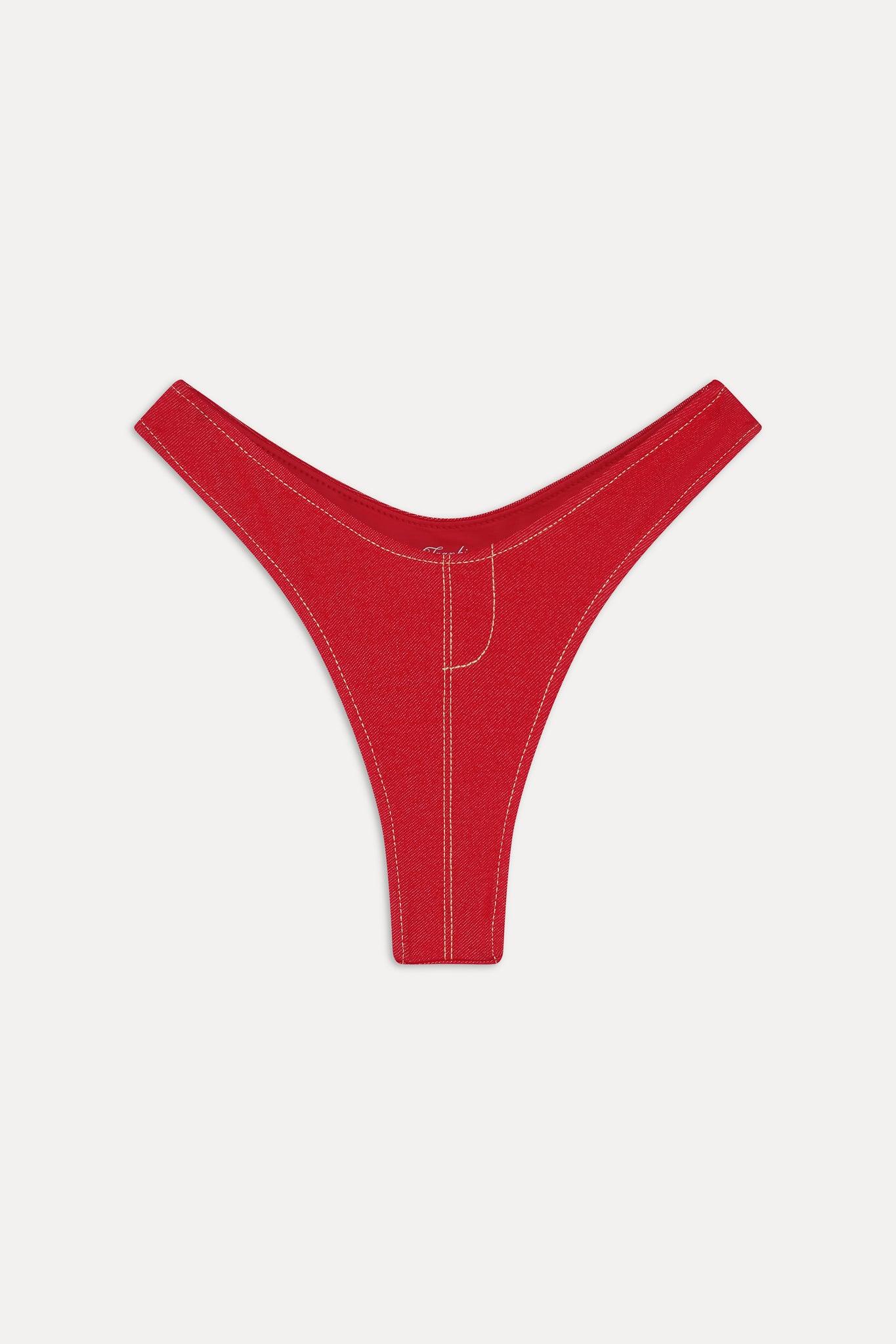 Introducing Full Moon, an ultra-flattering micro bikini bottom with a daring front dip. This barely-there style will be your latest vintage inspired bikini bottom. Details Low rise bikini Slimming high leg cut Soft denim swim fabric Contrast stitching