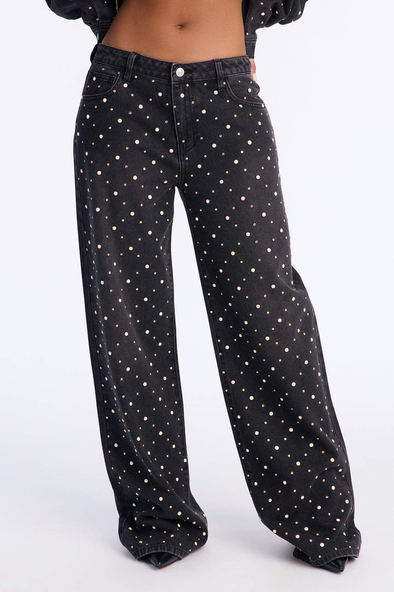 Available In Black Wash. Wide Leg Jeans Pair With Full On Fabulous Embellished Denim Jacket To Complete The Look! 5 Pocket Embellished 10.5" Rise 33" Inseam Non Stretch 74% Cotton 20% Polyester 6% Viscose Imported California Proposition 65WARNING: Cancer and Reproductive Harm - www.P65Warnings.ca.gov.
