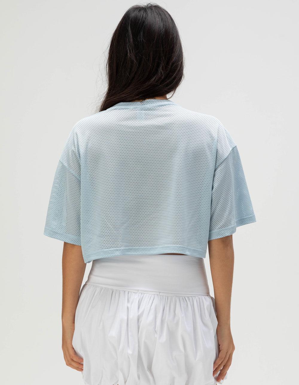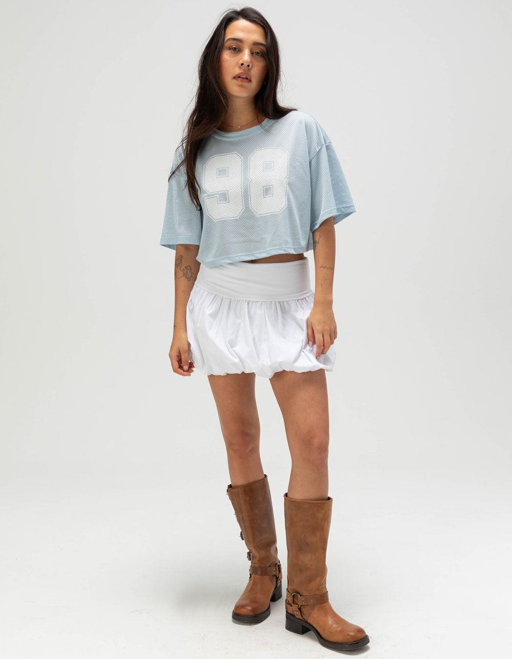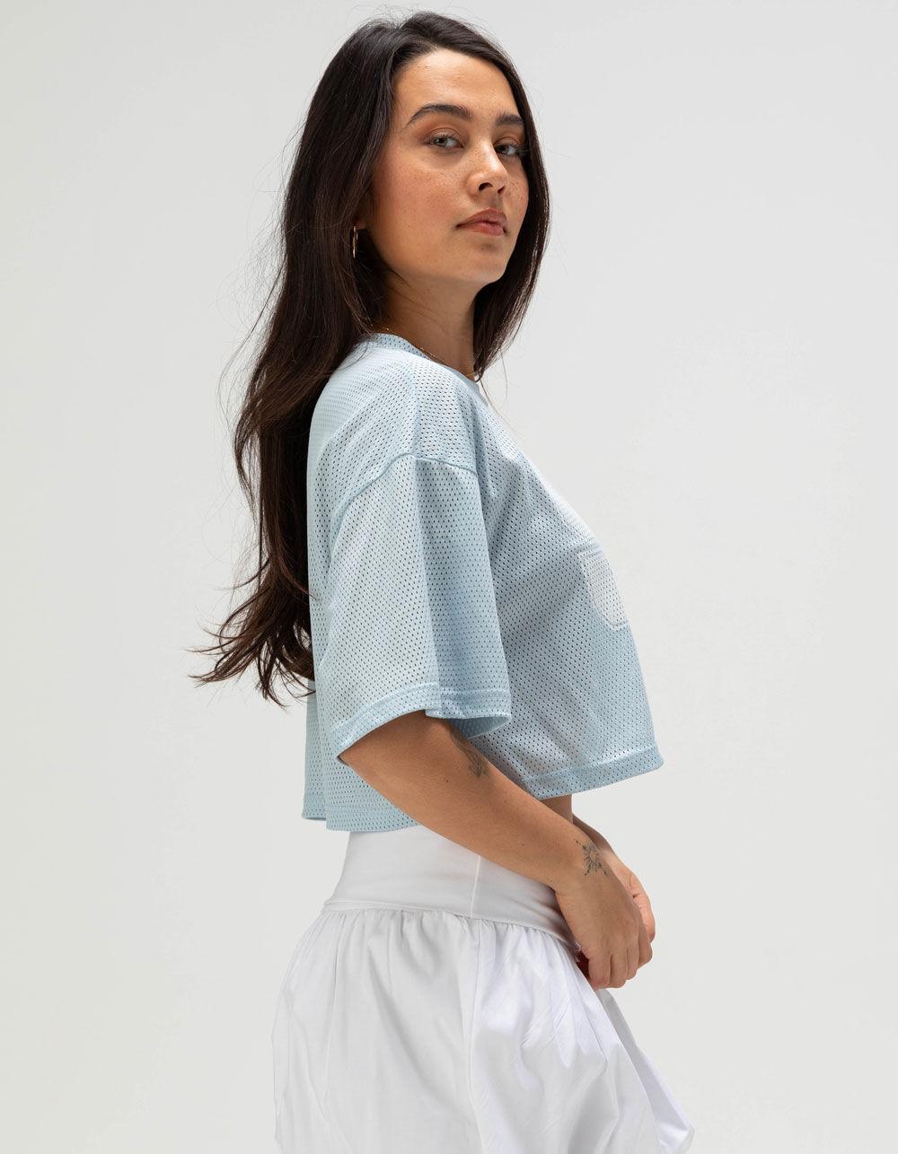BLUE. Full Tilt 98 Womens Crop Jersey. Mesh football-style jersey featuring the number 98 screened on the front. Cropped length. Crew neck. Short sleeve. 100% Polyester. Machine wash. Imported.