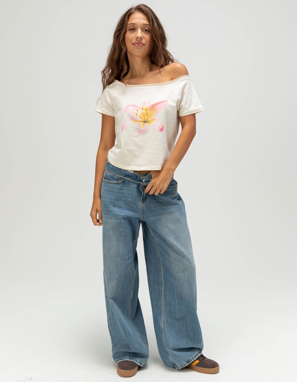 CREAM. Full Tilt Lily Off The Shoulder Top. Large lily graphic screened on front. Off-the-shoulder style. Short sleeve. 100% Cotton. Machine wash. Imported.