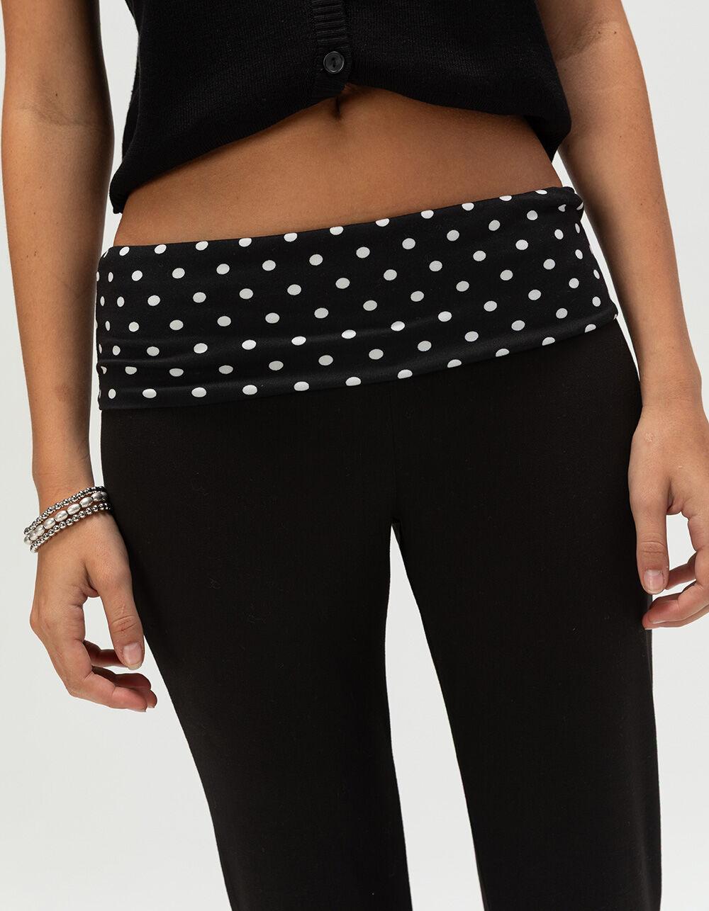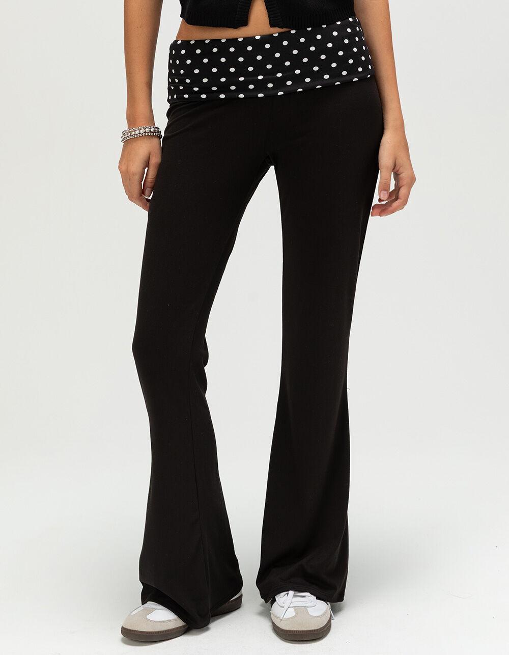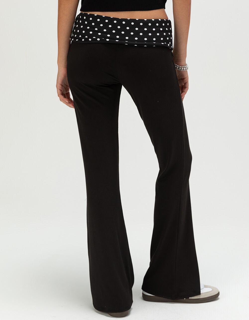 FULL TILT Womens Polka Dot Fold Over Waistband Flared Pants. Step into comfort and style with the Full Tilt Fold Over Waistband Flared Pants for women, crafted from a soft polyester-spandex blend that feels smooth against the skin. These black pull-on pants feature a playful fold-over polka dot waistband and a flattering flared leg, with an approximate 22" leg opening for an effortlessly chic silhouette. Designed for all-day wear, they combine gentle stretch with a soft, lightweight feel, making them perfect for lounging, casual outings, or layering for a polished look. 95% Polyester 5% Spandex. Hand wash. Imported.