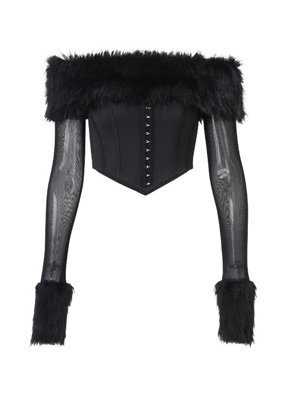 Fuzzy Trim Off Shoulder Mesh Breasted Corset Top
