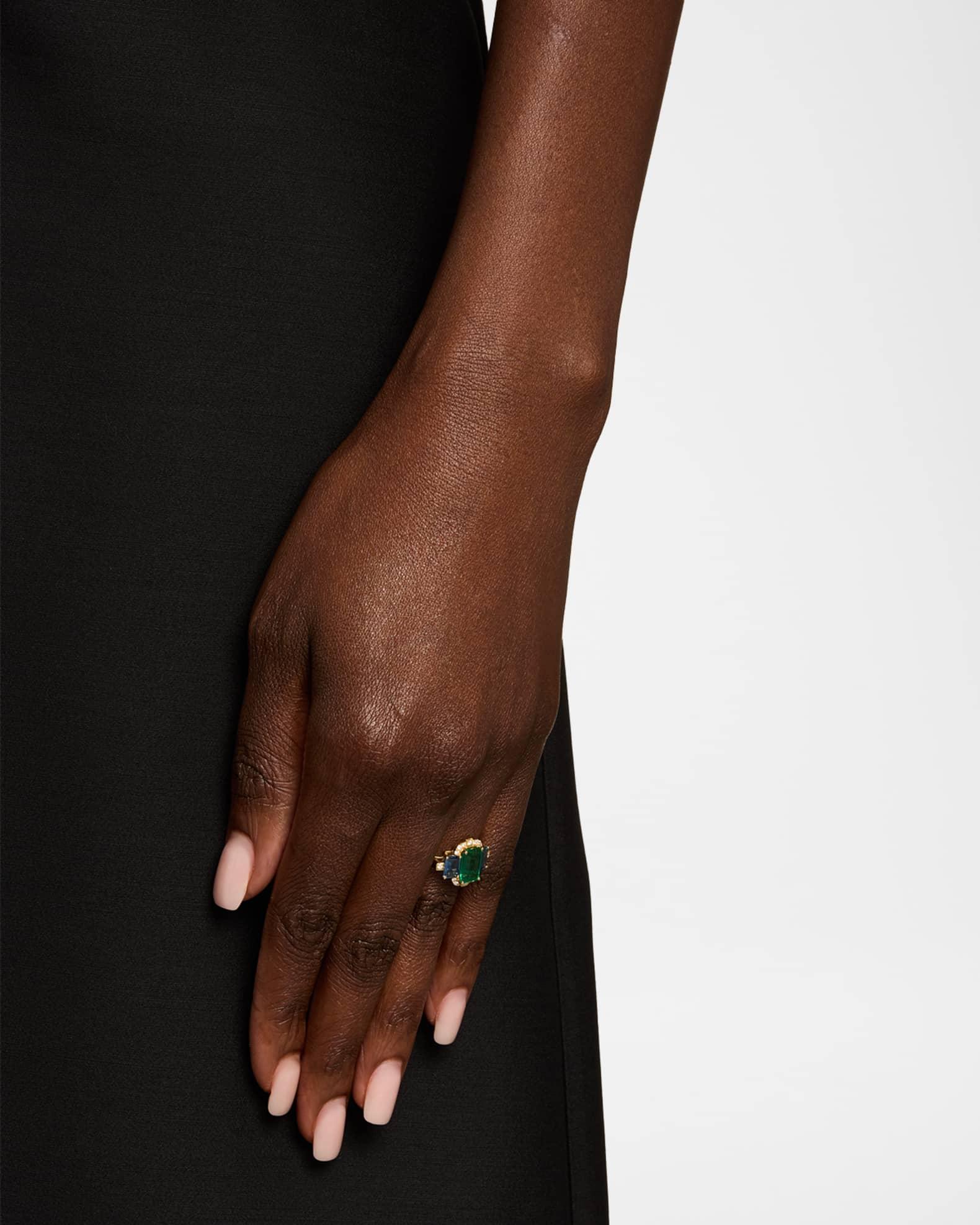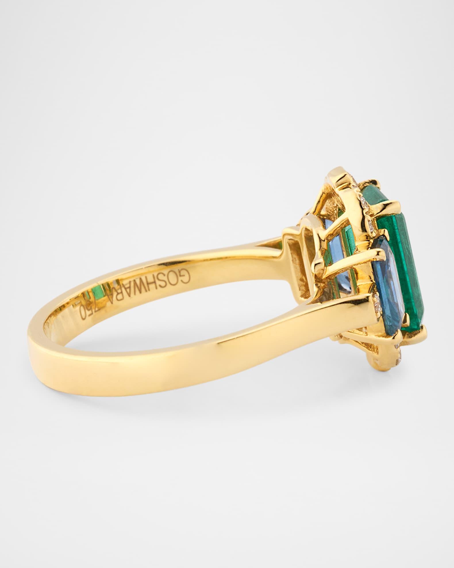 Blue sapphires and an emerald illuminate on this Goshwara G-One ring. Round white diamonds sparkle across the three-stone ring. Approx. 0.5" length Polished 18-karat yellow gold Diamond total carat weight: 0.13 Easily clean with soap and water Imported