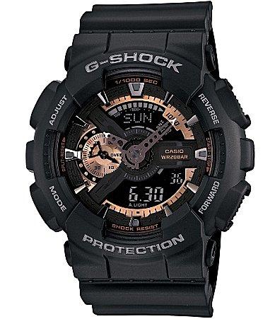 From G-Shock, the XL Ana-Digi Rose Gold Series Black Resin Strap Watch features: round caseblack dial with rose gold-tone accentsblack resin strapAnalog/Digital movementquartz multi-function movementauto LED lightcountdown timerauto-calendar5 alarms1/1000th-second stopwatch12/24 hour formatsshock and magnetic resistantcase size approx. 55mm x 51.2mmWater Resistance: 200MImported.