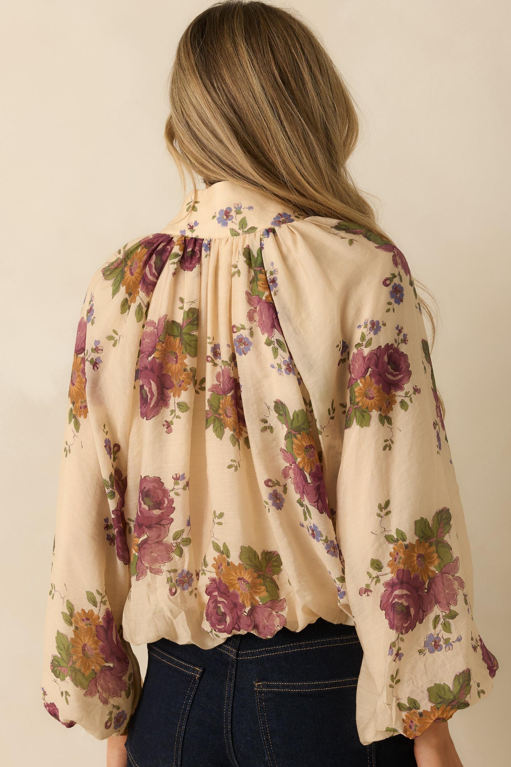 The Garden Daydream Ivory Multi Floral Peasant Sleeve Blouse brings a touch of soft romance to the everyday. Its billowing sleeves, vintage-inspired florals, and airy drape make every outfit feel that little bit more graceful. Whether styled with denim or tucked into something tailored, it's floral moment that never feels overdone. This ivory multi floral print blouse features a split neckline with a stand collar, gathered shoulders, long blouson sleeves with elastic cuffs, and a relaxed silhouette with an elastic hemline. 82% Tencel & 18% Nylon Lined: 100% Polyester Hand Wash Cold Manufactured in China Designed in The USA Model is 5'8" and Wearing a Size Small, Clipped, Model is a True X-Small