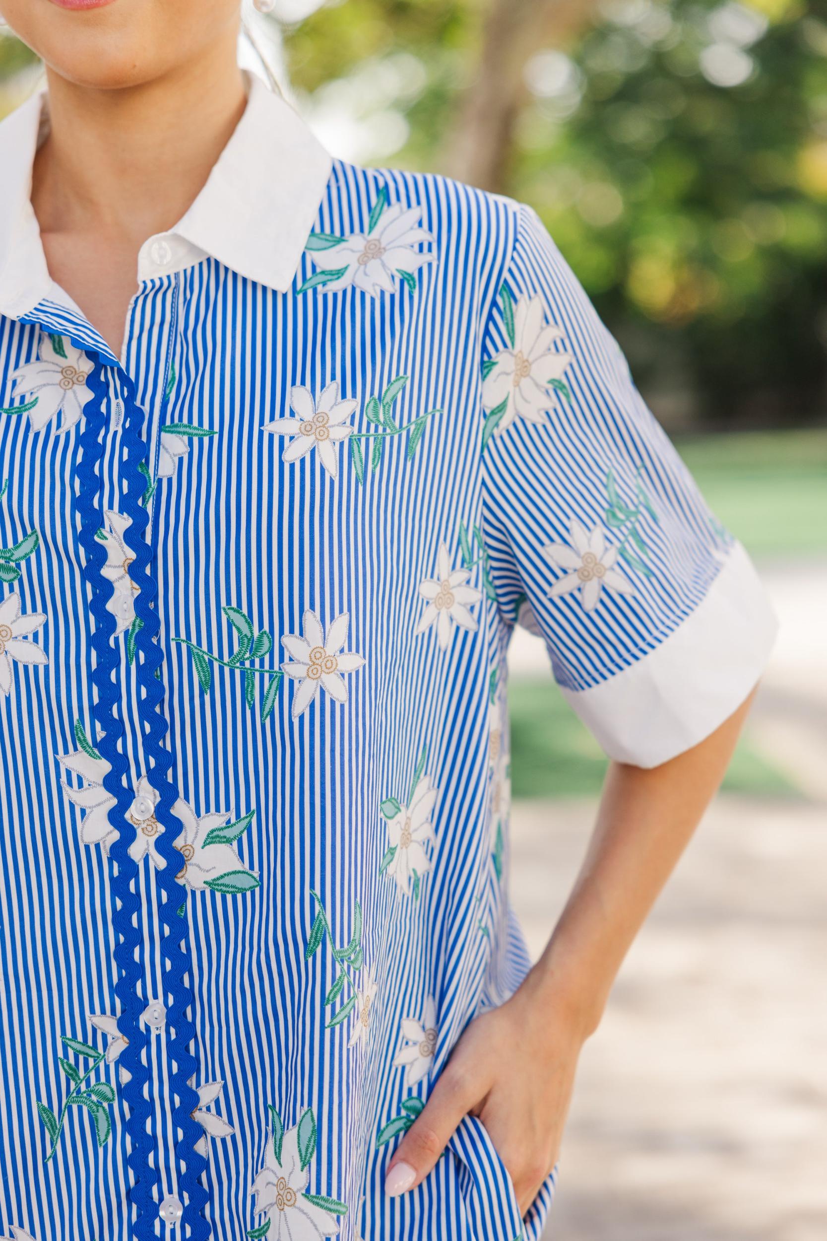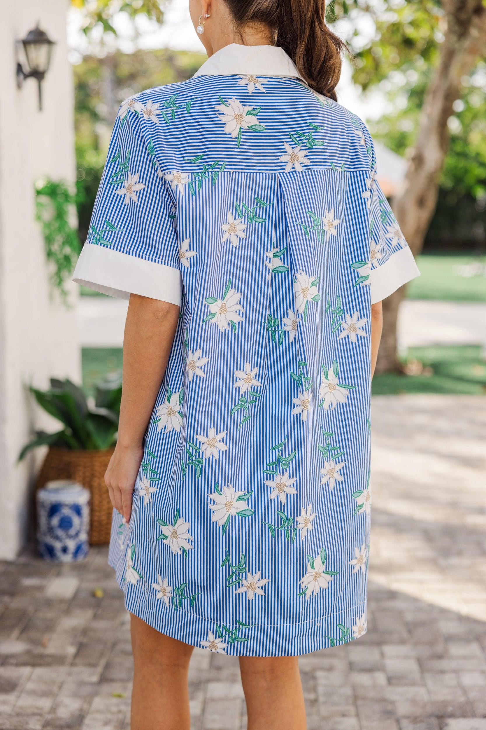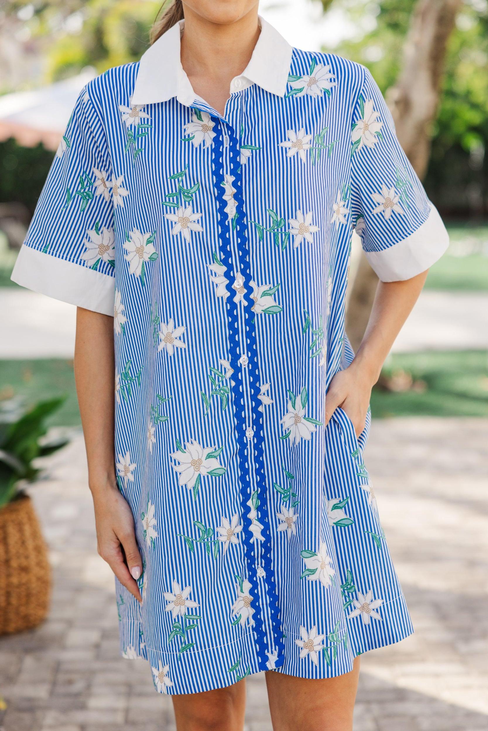 Effortless charm meets timeless style in the Garden Party dress! This breezy button-down dress features a classic blue-and-white stripe pattern adorned with delicate floral accents, creating a fresh and feminine feel. The relaxed silhouette, collared neckline, and cuffed short sleeves make it perfect for warm-weather outings. Whether you're strolling through the farmers market or headed to brunch, this dress is an easy go-to for chic, casual elegance! Classic collared neckline Button down front closure Short sleeves Pockets Floral and striped print Material has no amount of stretch Sydney is wearing the small.