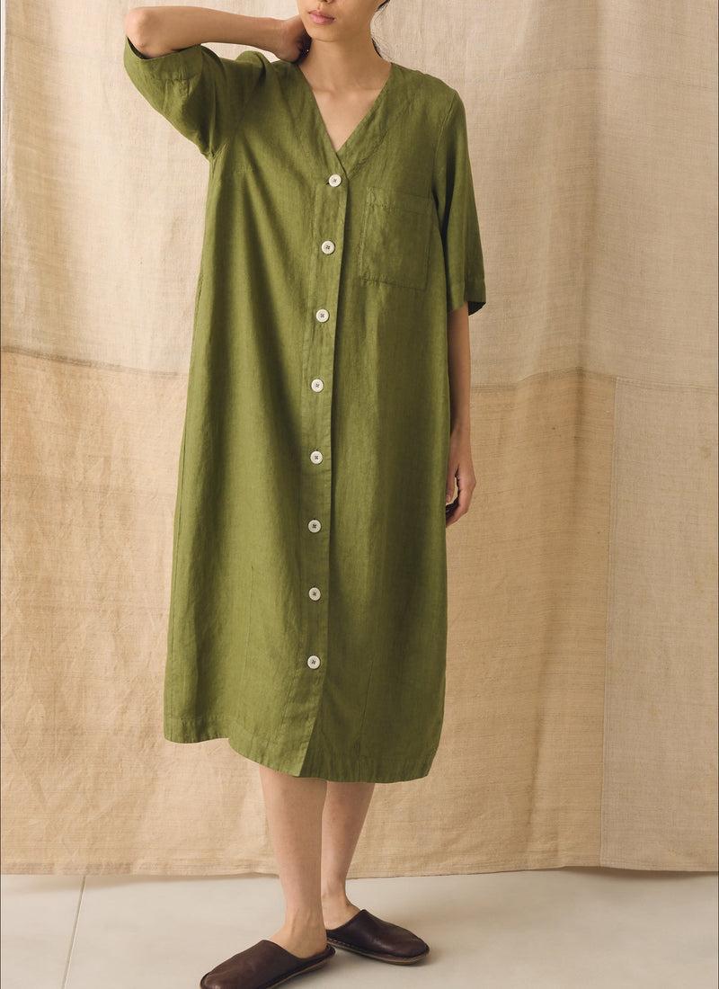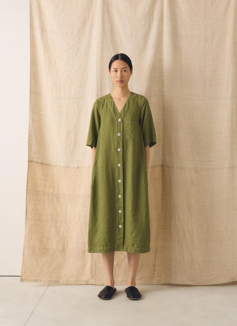 Darts at the hem of our linen dress create a gently rounded silhouette. Shaped with a V-neck and three-quarter-length sleeves, then punctuated by a row of corozo buttons and garment-dyed for a rich depth of colour.