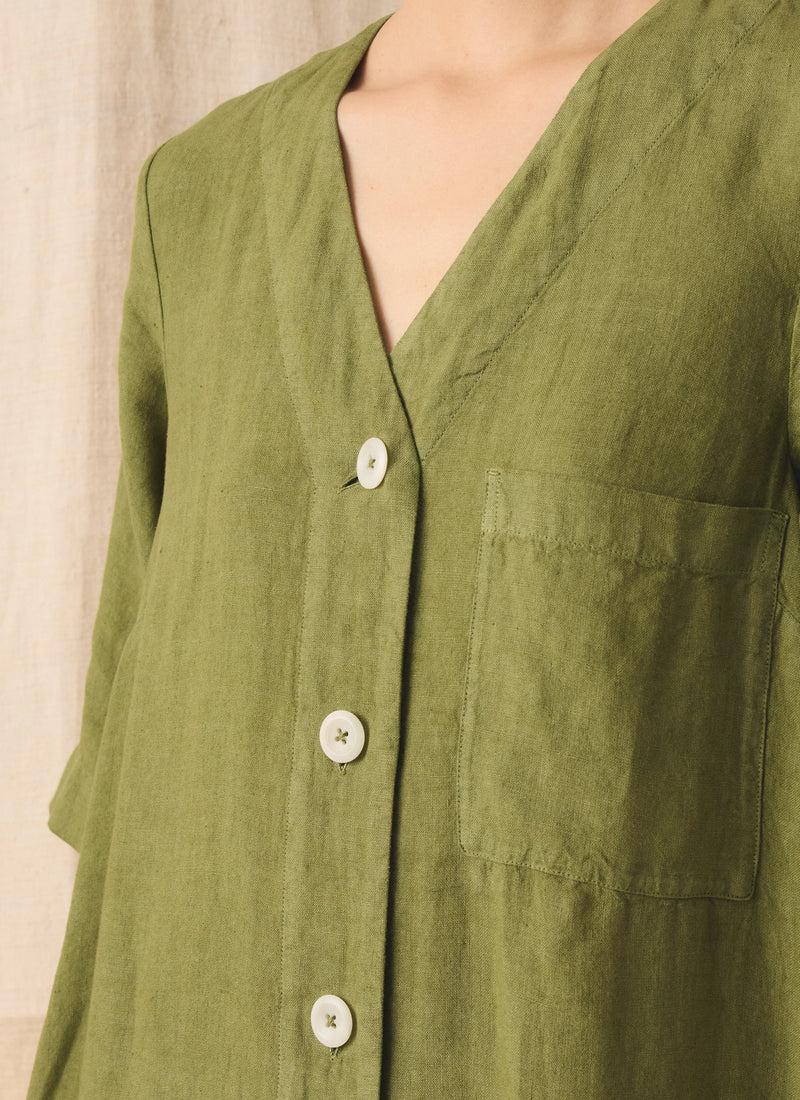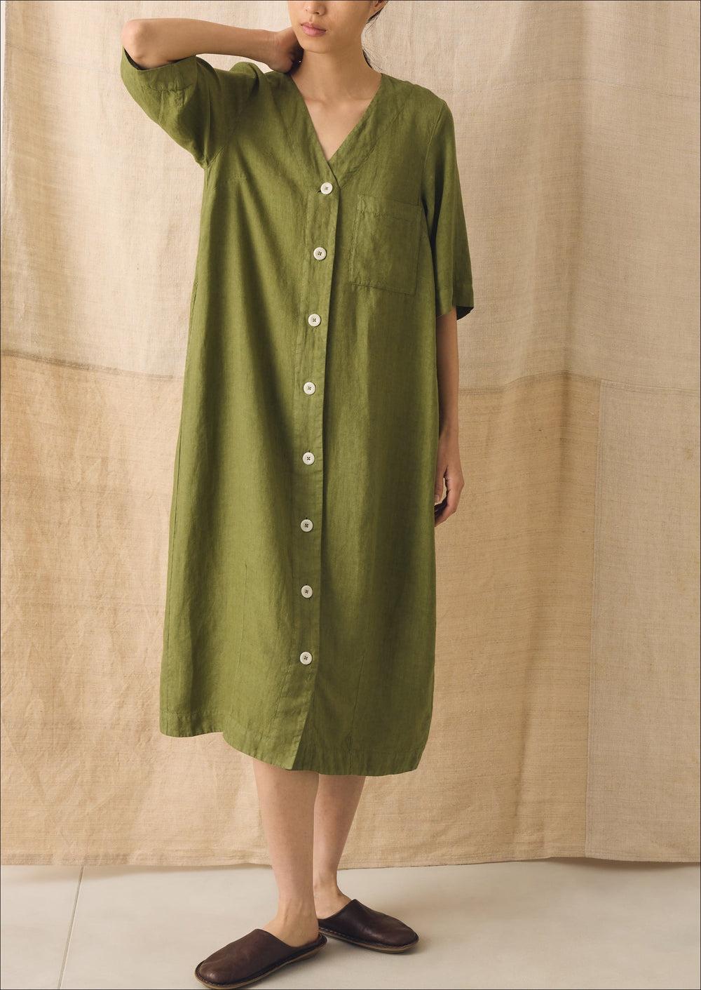 Linen. Garment-dyed. Easy fit. V-neck. Chest patch pocket. Three-quarter-length sleeves. Side seam pockets. Lower-calf length. Internal herringbone hanging loop. Corozo buttons.