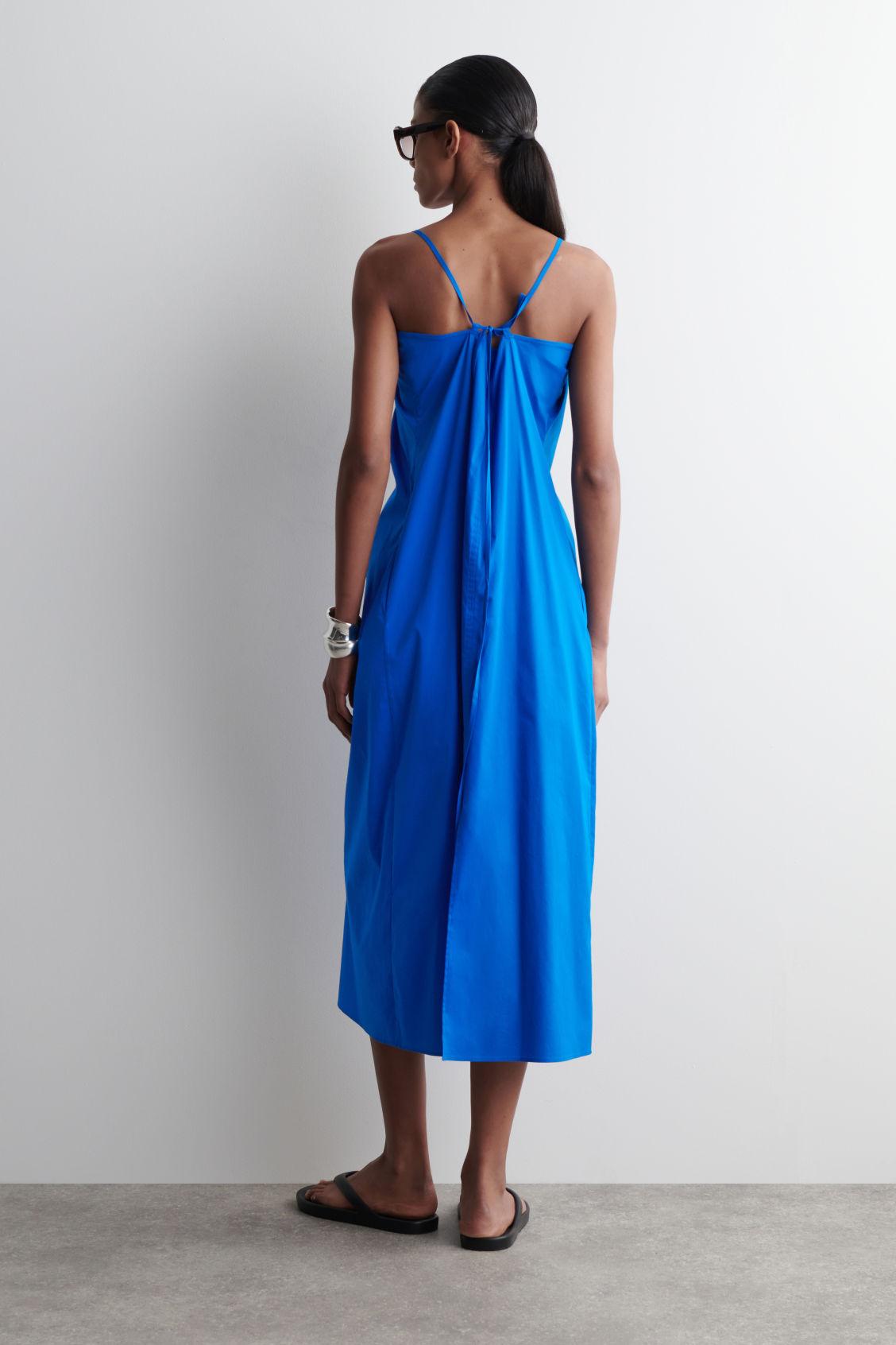 This season, the womenswear team propose a considered take on the classic maxi dress. Rendered in a vibrant cobalt tone, this modern piece is designed with a deep V-neckline that's ruched for definition and has slender straps that tie into a bow at the back. It's made from a lightweight cotton blend that lends itself to balmy days. Regular fitSide-seam pocketsRecycled polyamide is polyamide made from textile waste in production Shell: 71% Cotton, 25% Recycled polyamide (Recycled nylon), 4% Elastane. Excluding trims / Machine wash Back length of size EU 36 is 104.8cm / Model wears a size EU 36