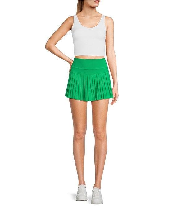 From GB, this tennis skirt features: High rise Fitted double waistband Ultra mini-length Built-in shorts Pleated detailing Pull-on styling Polyester/spandex Machine wash/dry flat Imported.