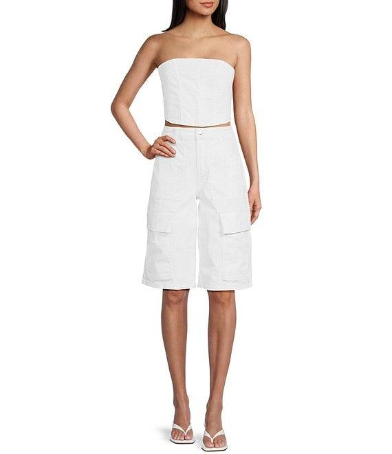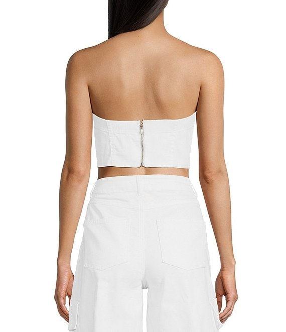 From GB, this top features: Denim fabrication Strapless Zip back closure Cotton/spandex Machine wash/tumble dry Imported.