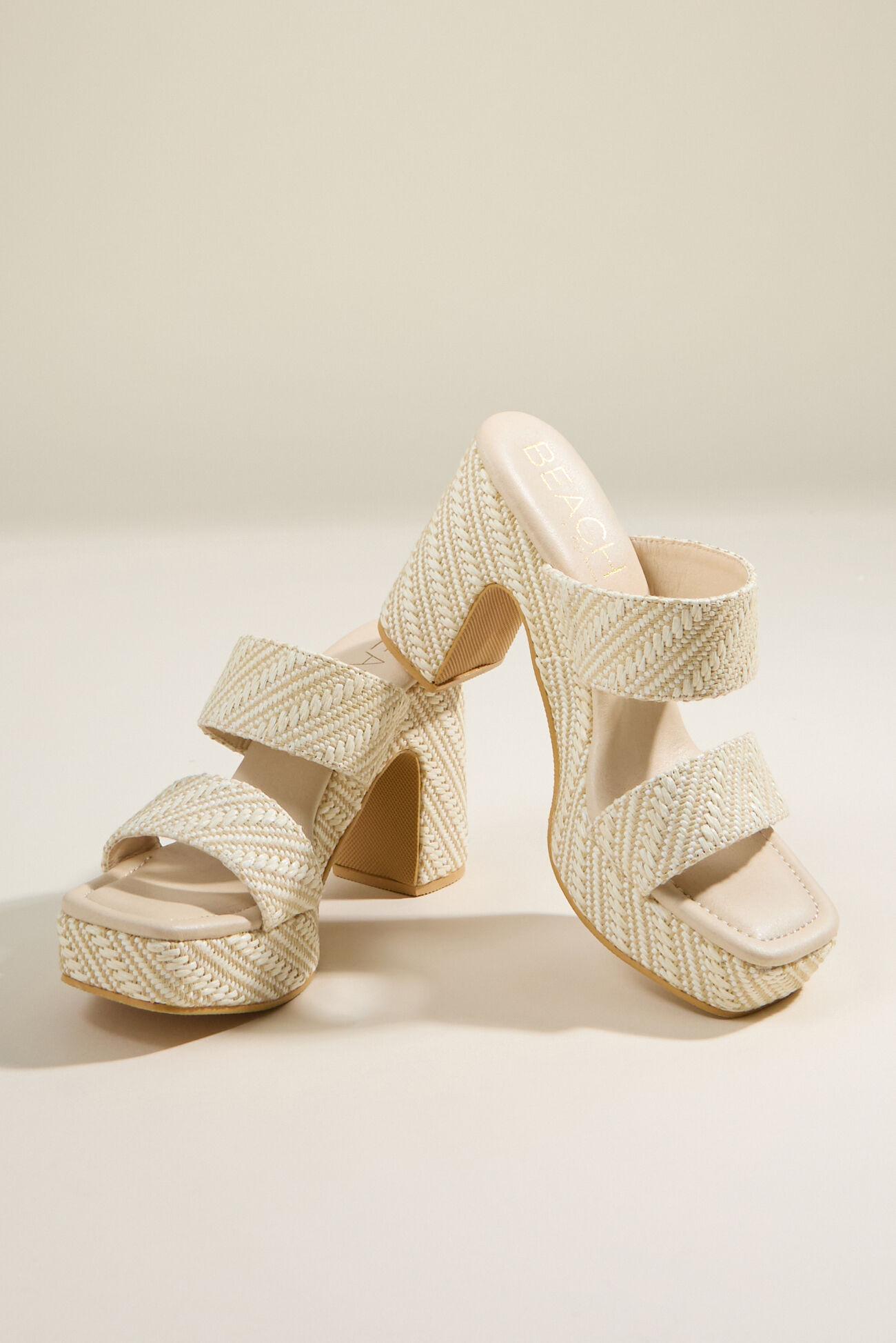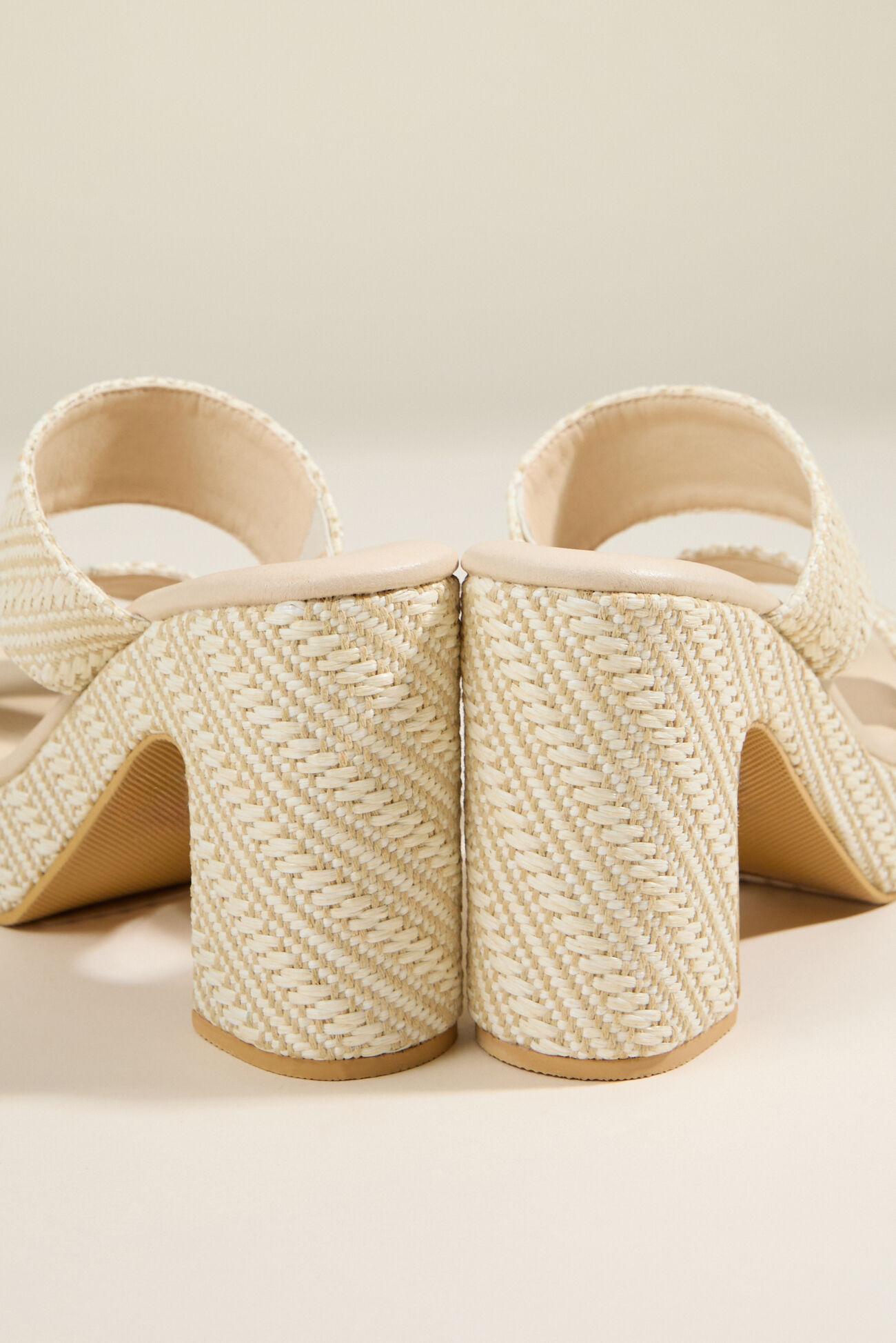 These heels take the classic mule silhouette and elevate it with two distinct, intricately woven straps. The texture-rich design creates a sophisticated, handcrafted look.