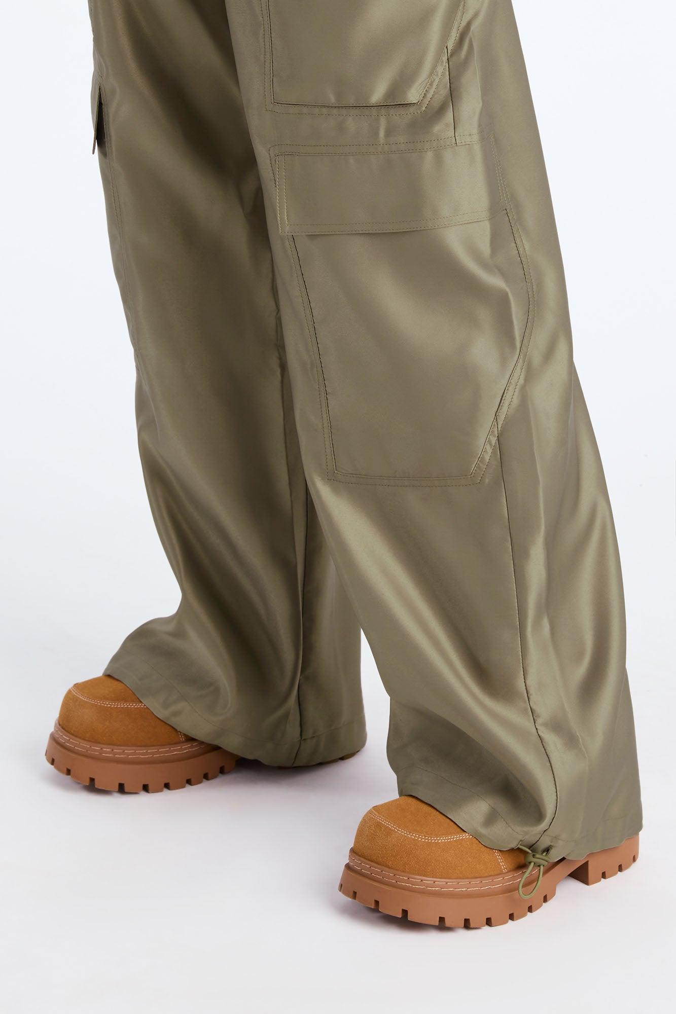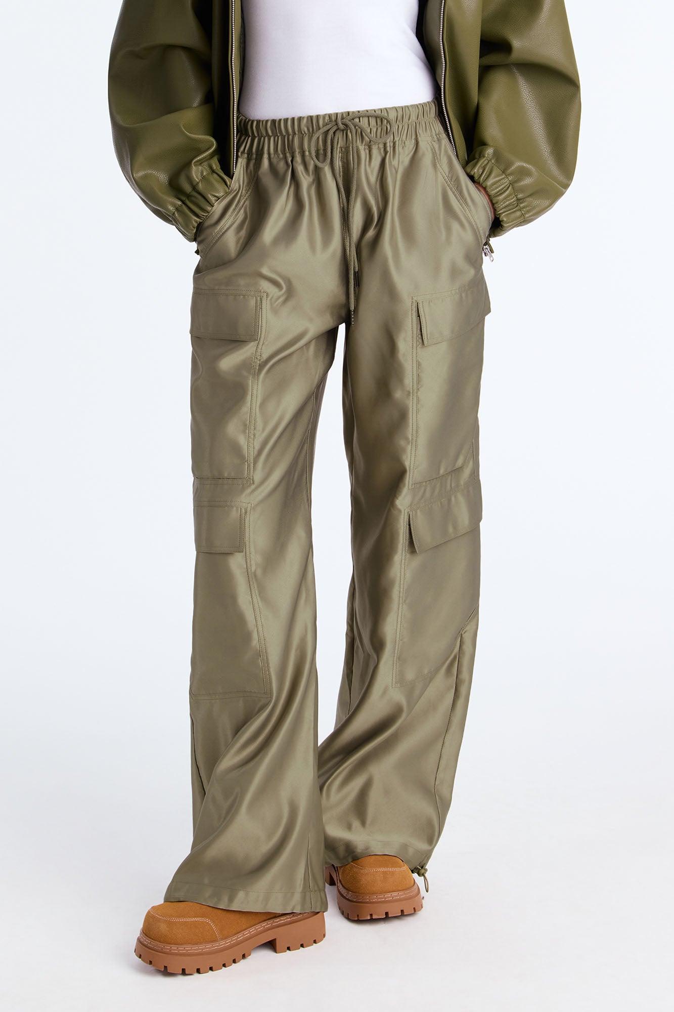 Available In Chocolate And Olive. Jogger Pant Mid Rise Drawstring Elastic Waist Cargo Utility Pockets Elastic Bungie Detail 31" Inseam Non Stretch Satin Self: 100% Polyester Imported California Proposition 65WARNING: Cancer and Reproductive Harm - www.P65Warnings.ca.gov.