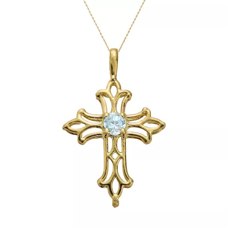 A lab-created opal stone and filigree details give this cross pendant eternal beauty. Pendant Details: Pendant length: .86-in. Necklace length: 18-in. Clasp: spring-ring Metal: 10k goldGemstone Details: Gemstone type: lab-created opal Cut: round Setting: prong Size: 18. Color: White. Gender: female. Age Group: adult.