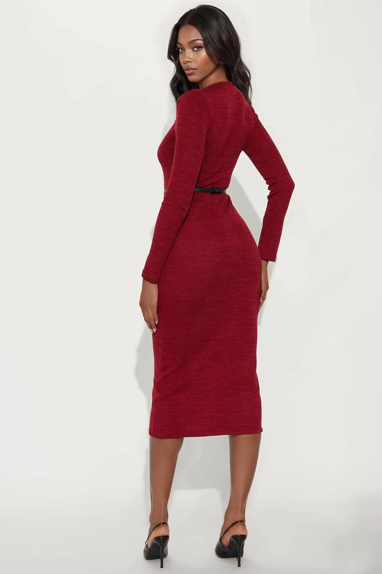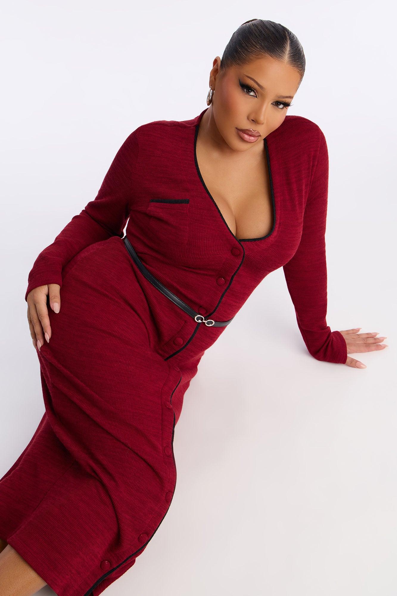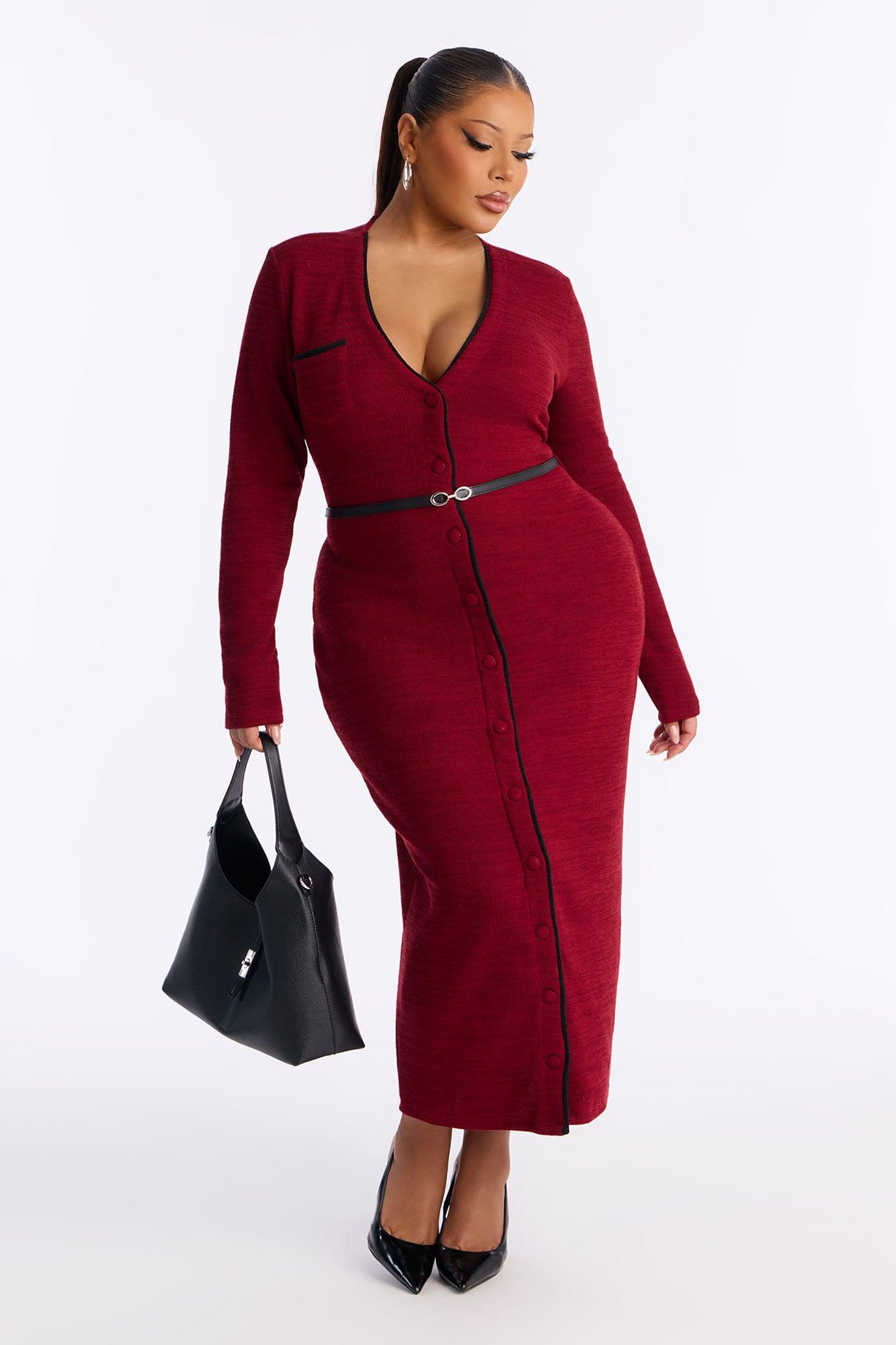 Available In Brown Combo And Burgundy/combo. Sweater Midi Dress V-Neck Long Sleeve Contrast Trim Pocket Belted Button Up Stretch Length Measured Flat = 47" Self: 94% Polyester 6% Spandex Contrast: 94% Polyester 6% Spandex Imported California Proposition 65WARNING: Cancer and Reproductive Harm - www.P65Warnings.ca.gov.