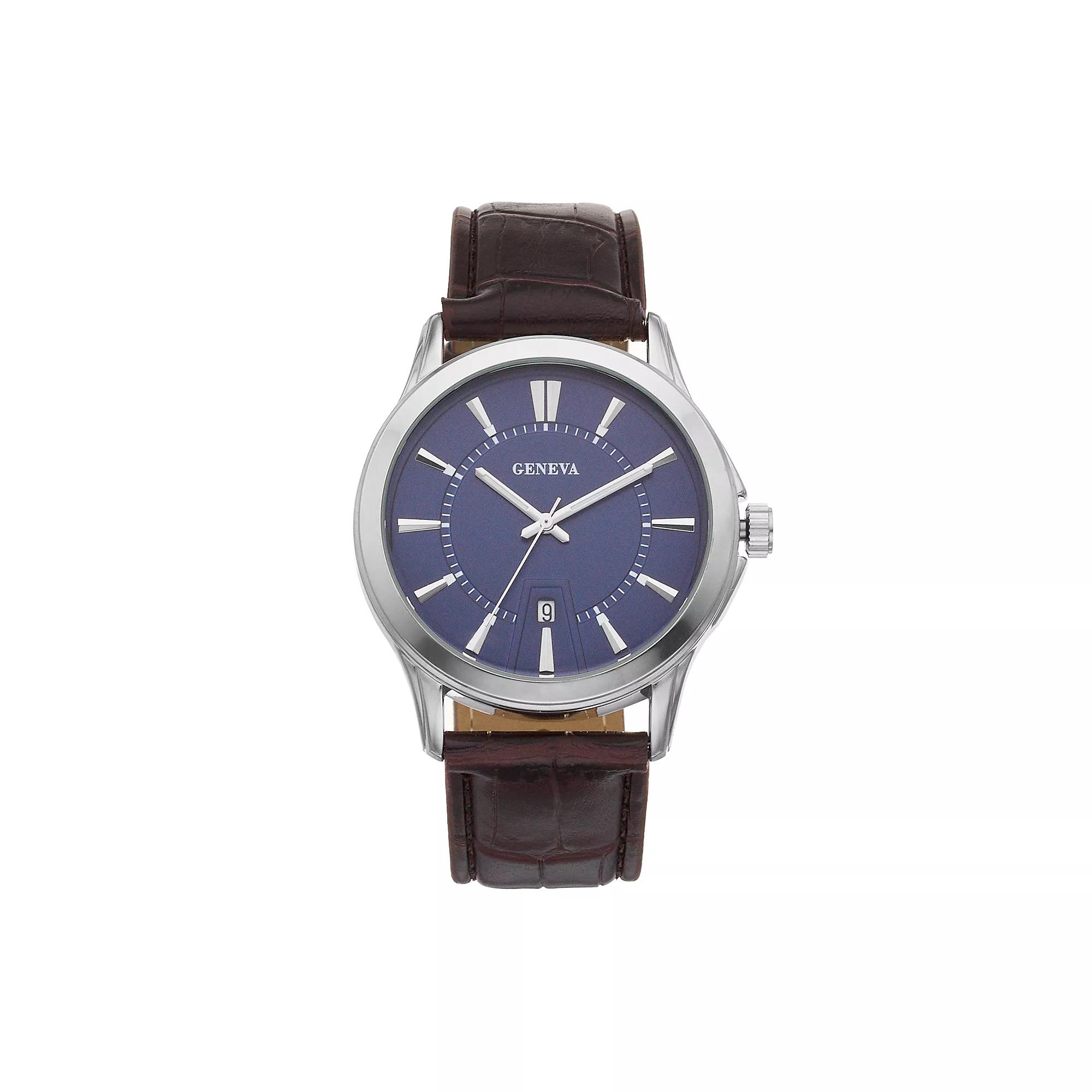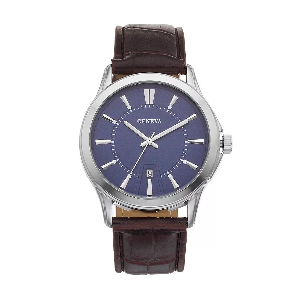 Tasteful and timeless, this men's Geneva watch will simply never go out of style.FEATURES Date window DISPLAY Dial color: blue Face cover material: glass CASE Material: silver-tone alloy with stainless steel back Diameter: 40 mm BAND Material: brown faux leather Clasp: buckle Circumference: 200 mm Width: 22 mm DETAILS Movement: quartz Power: battery Water resistance: no rating Packaging: boxed Warranty: manufacturer's 1-year limited For warranty information please click here Model number: KH8070SL Size: Large. Gender: male. Age Group: adult.
