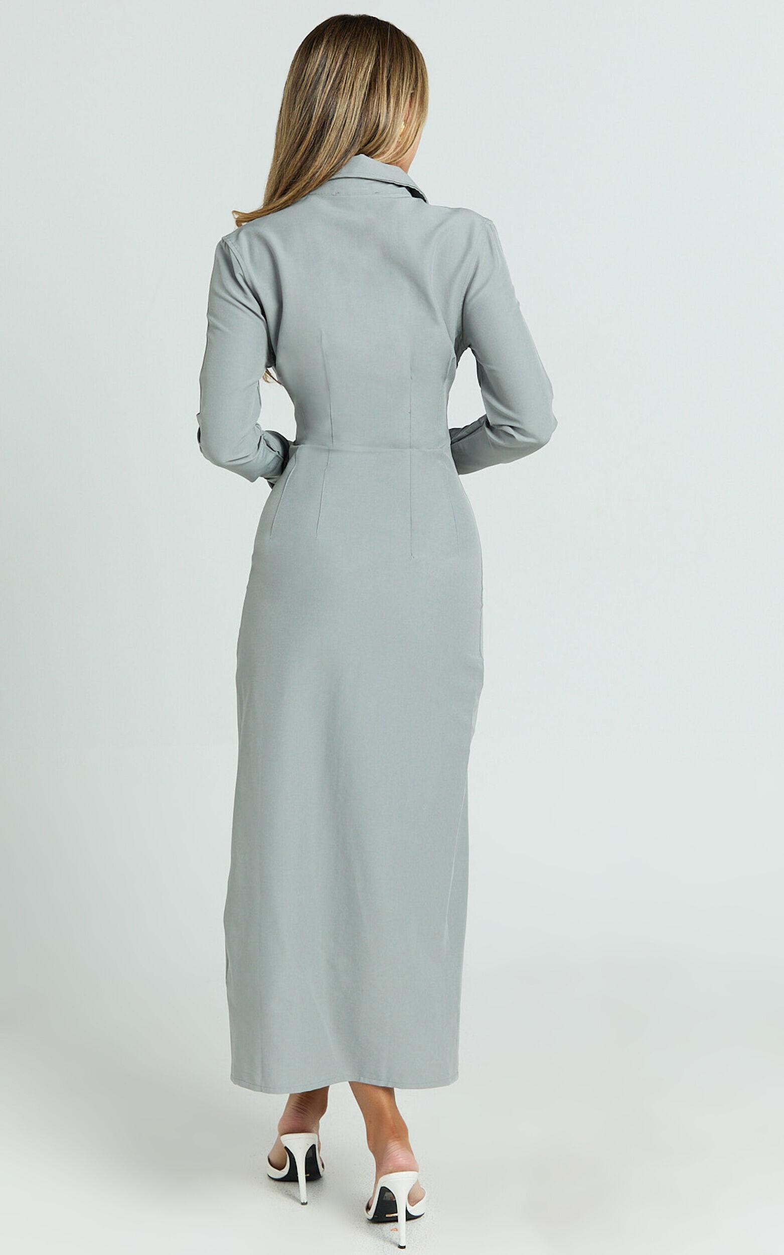 Crafted in sleek, light grey fabric, this slim-fitting shirt dress captures minimalist sophistication and effortlessly flatters your figure. Its button-down front and refined collar detail offer subtle elegance inspired by runway trends, making it an essential, versatile piece for your wardrobe.Ideal for desk-to-dinner occasions or casual weekend brunches, style this monochrome beauty with pointed-toe heels and delicate gold jewelry for a polished daytime look. Want a more relaxed, street-style vibe? Layer a cropped knit sweater over the top and pair with chunky ankle boots. Wherever your day takes you, Genevieve ensures you'll look effortlessly chic.Product Details:Fitted midi dressLight weight wovenPolyester materialCollared necklineLong sleevesButton detailsIdeal for workwear