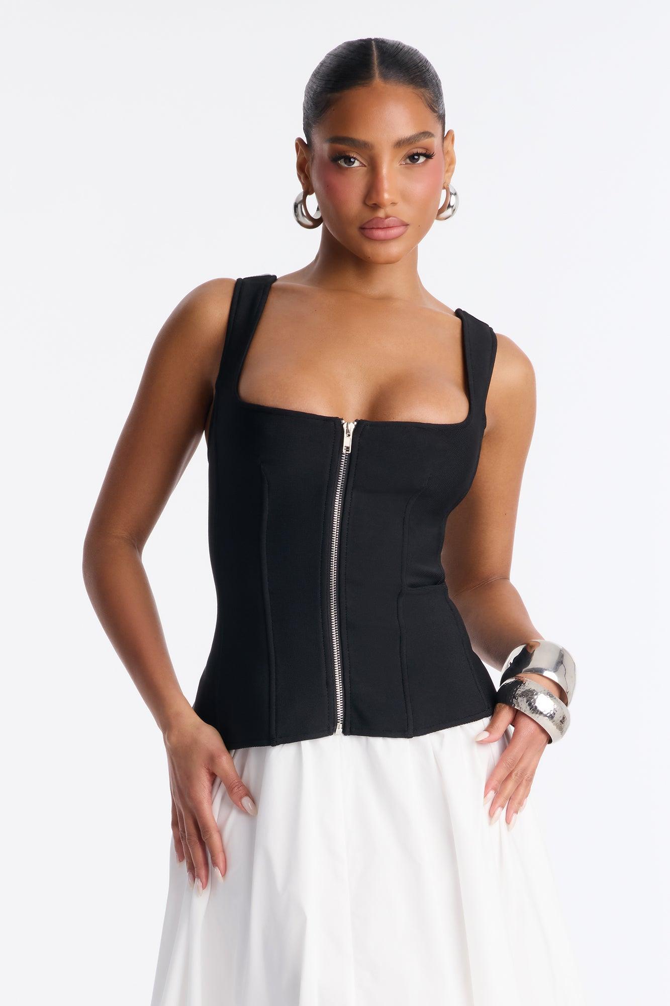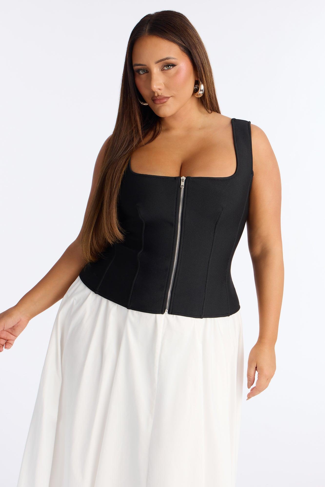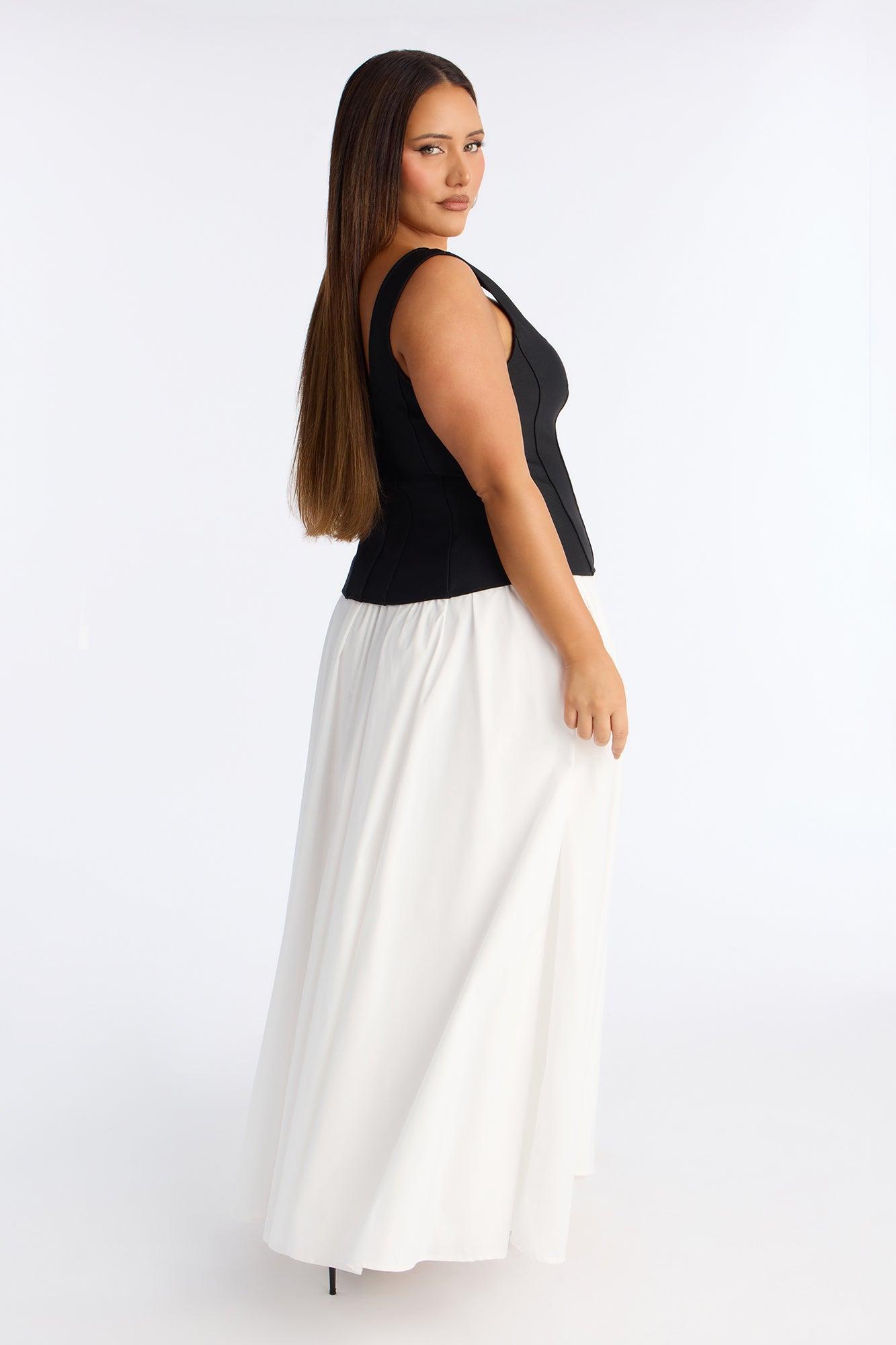 Available In Black/White. Maxi Dress Bandage Bodice Sleeveless Square Neckline Zipper Front Peplum Poplin Skirt Lined Stretch Self: 95% Polyester 5% Spandex Contrast: 68% Cotton 35% Polyester Lining 1 & 2: 100% Polyester Imported