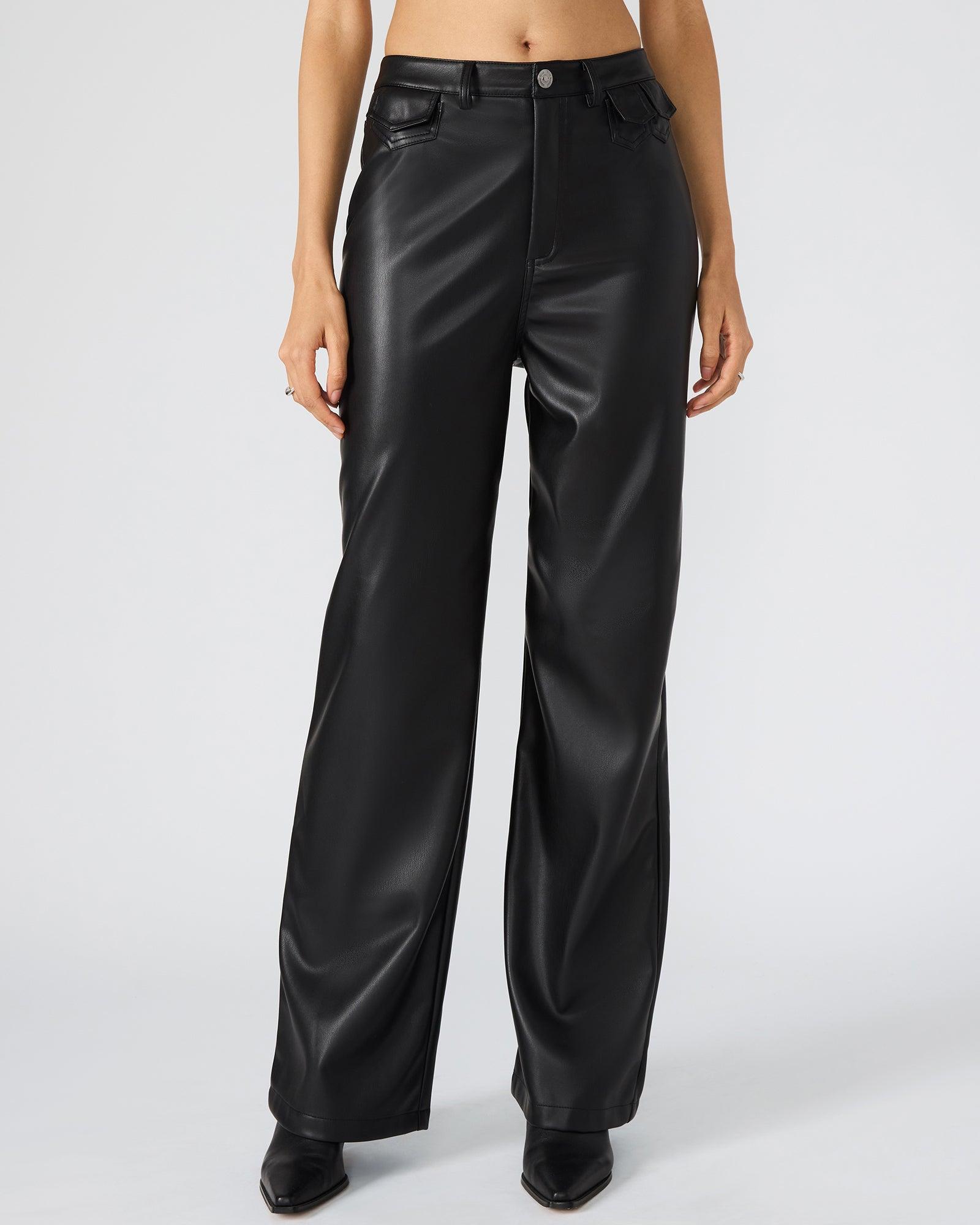 These GERALDINE pants feature a sleek faux leather finish with a straight-leg cut for a modern, tailored silhouette. Designed with a button and zipper closure, they offer both style and secure fit. Perfect for elevating your wardrobe with a polished, edgy look. Faux leather pants Straight-leg design Button and zipper closure Front and back pockets 100% polyurethane Wipe clean Aqua is 5ft 10in and is wearing a size 26 Imported