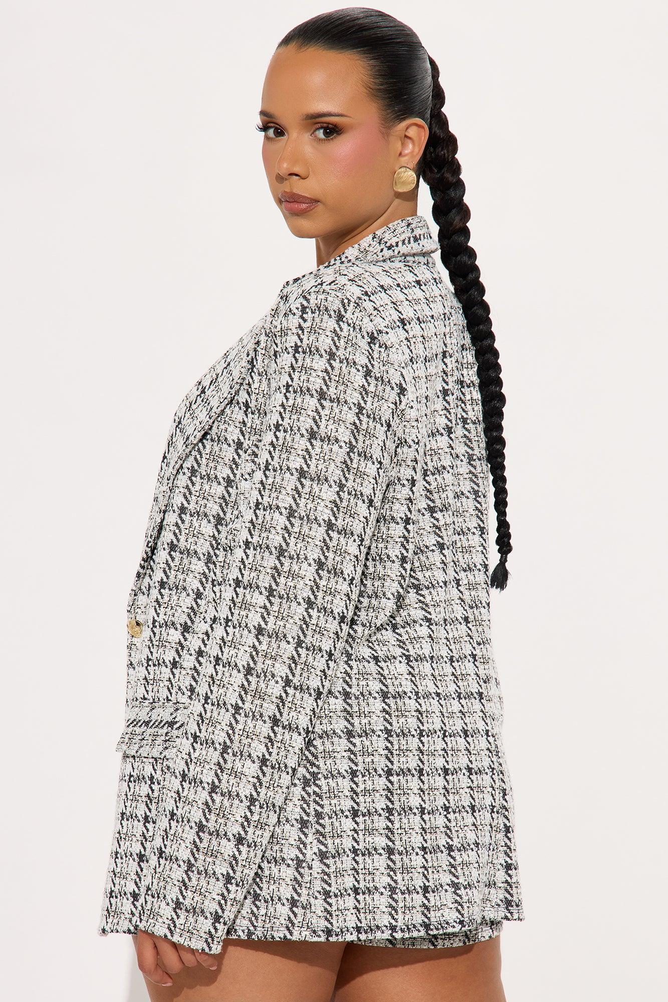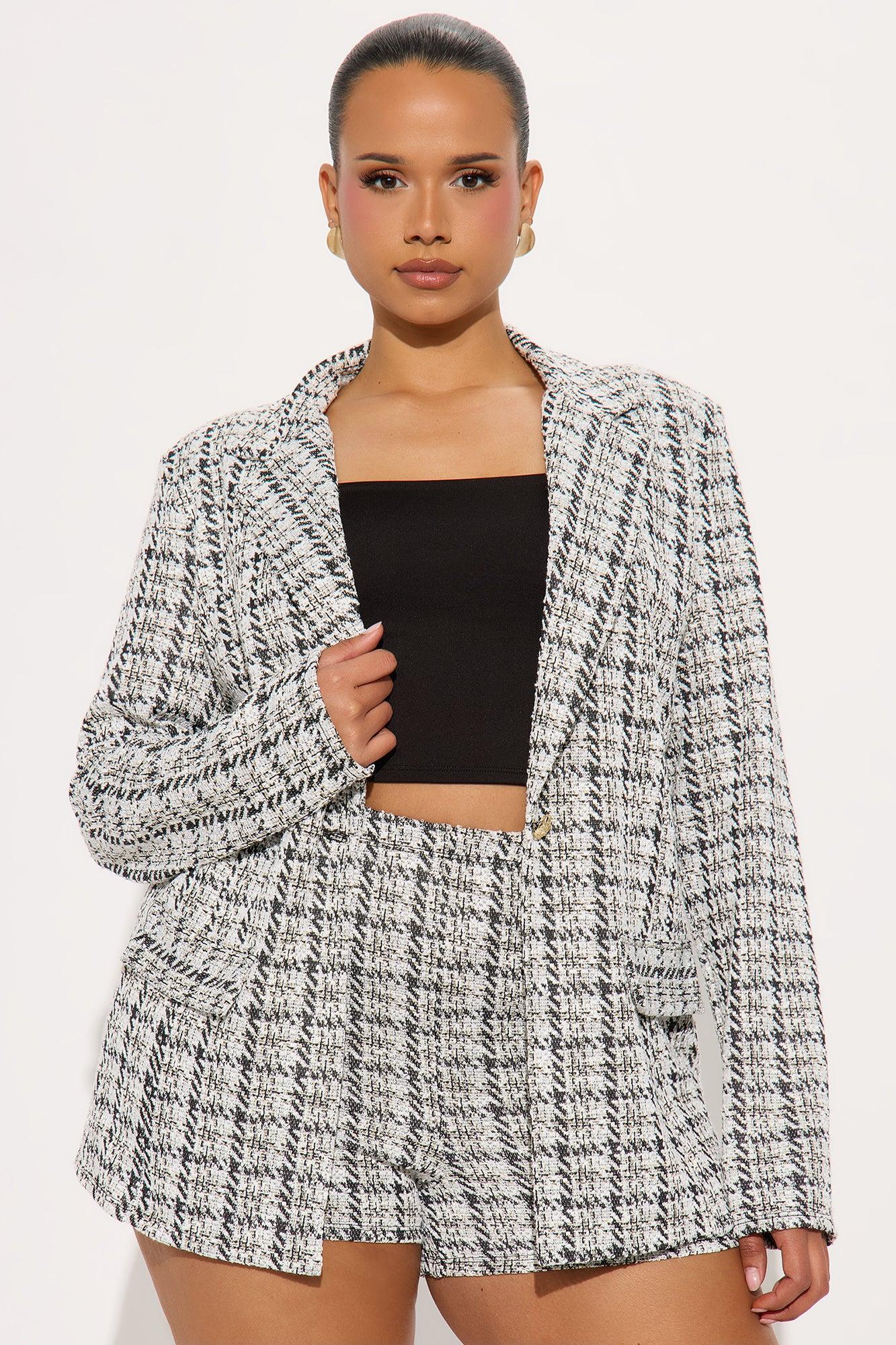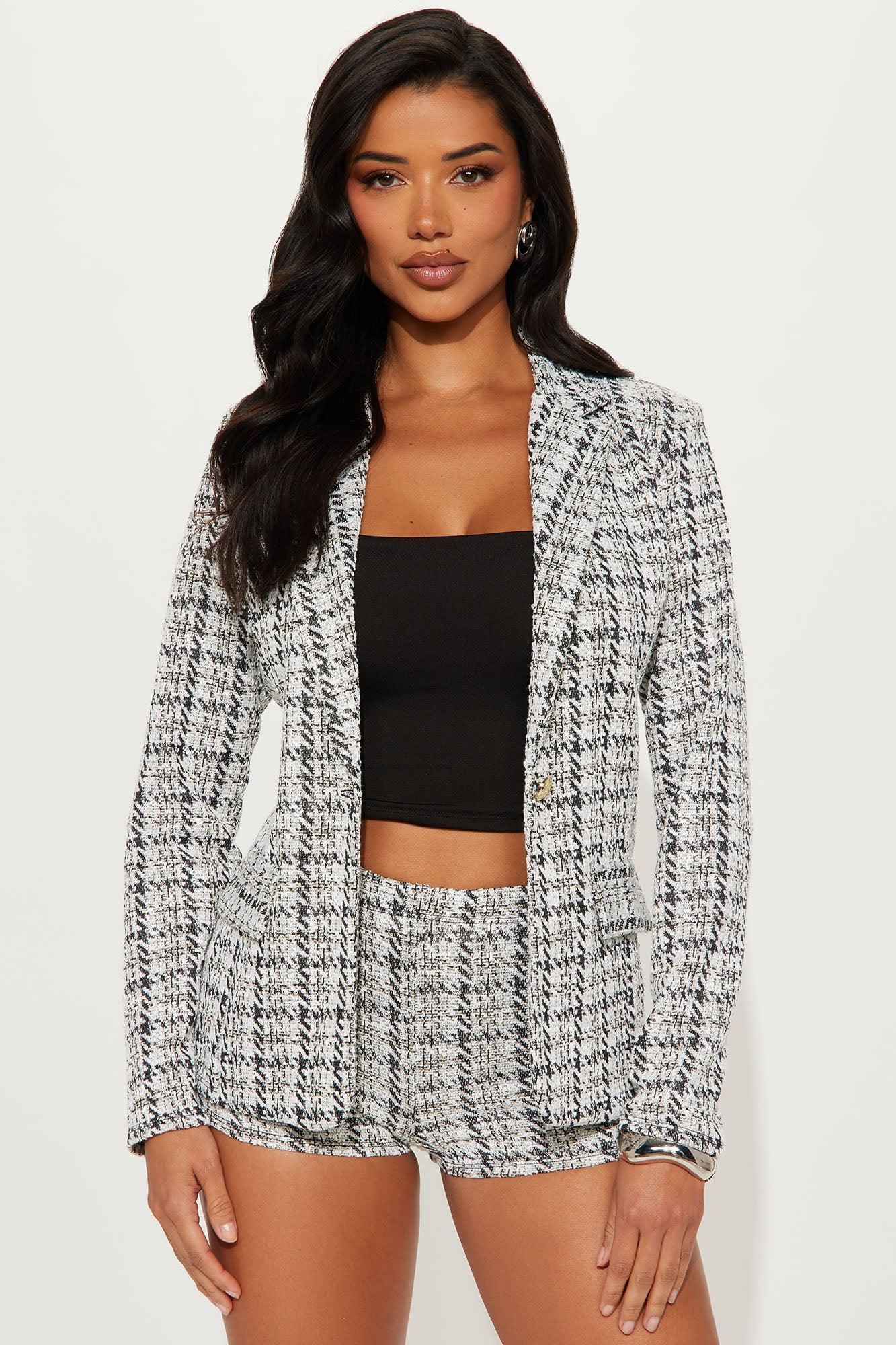 Available In Pink/combo And Black/combo. Blazer Lapel Collar Long Sleeve Tweed Foe Pockets Button Closure Non Lined Pair With "Get A Clue Tweed Micro Short" 51% Cotton 40% Polyester 8% Metallic Yarn 1% Spandex Imported California Proposition 65WARNING: Cancer and Reproductive Harm - www.P65Warnings.ca.gov.
