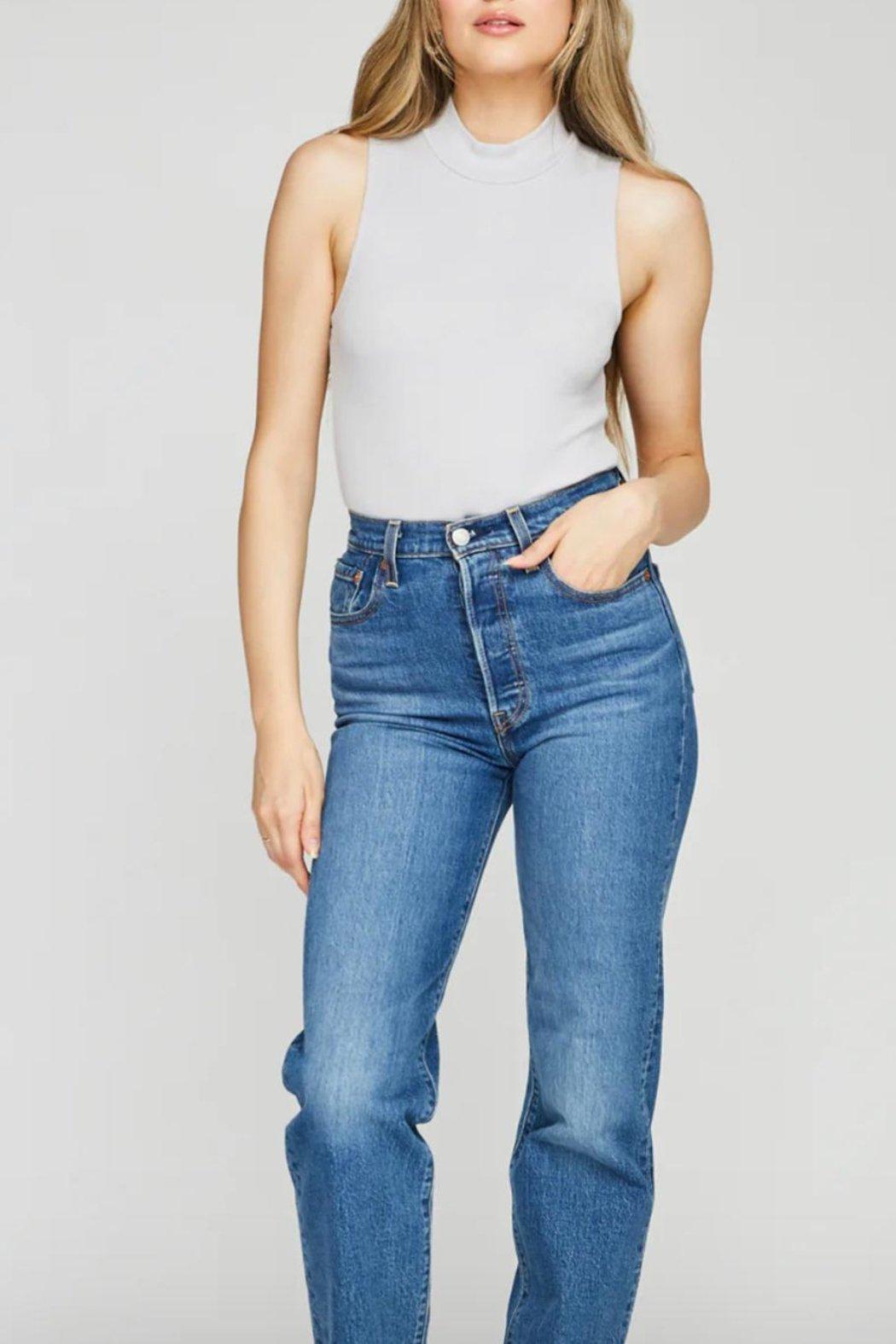 The Salma bodysuit is made of a stretchy ribbed fabric that hugs the body. Features include a mock neckline, adjustable snap closure, and a thong-cut bottom.