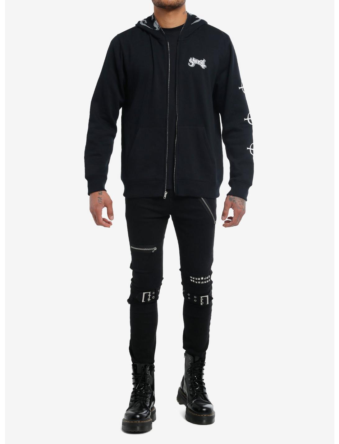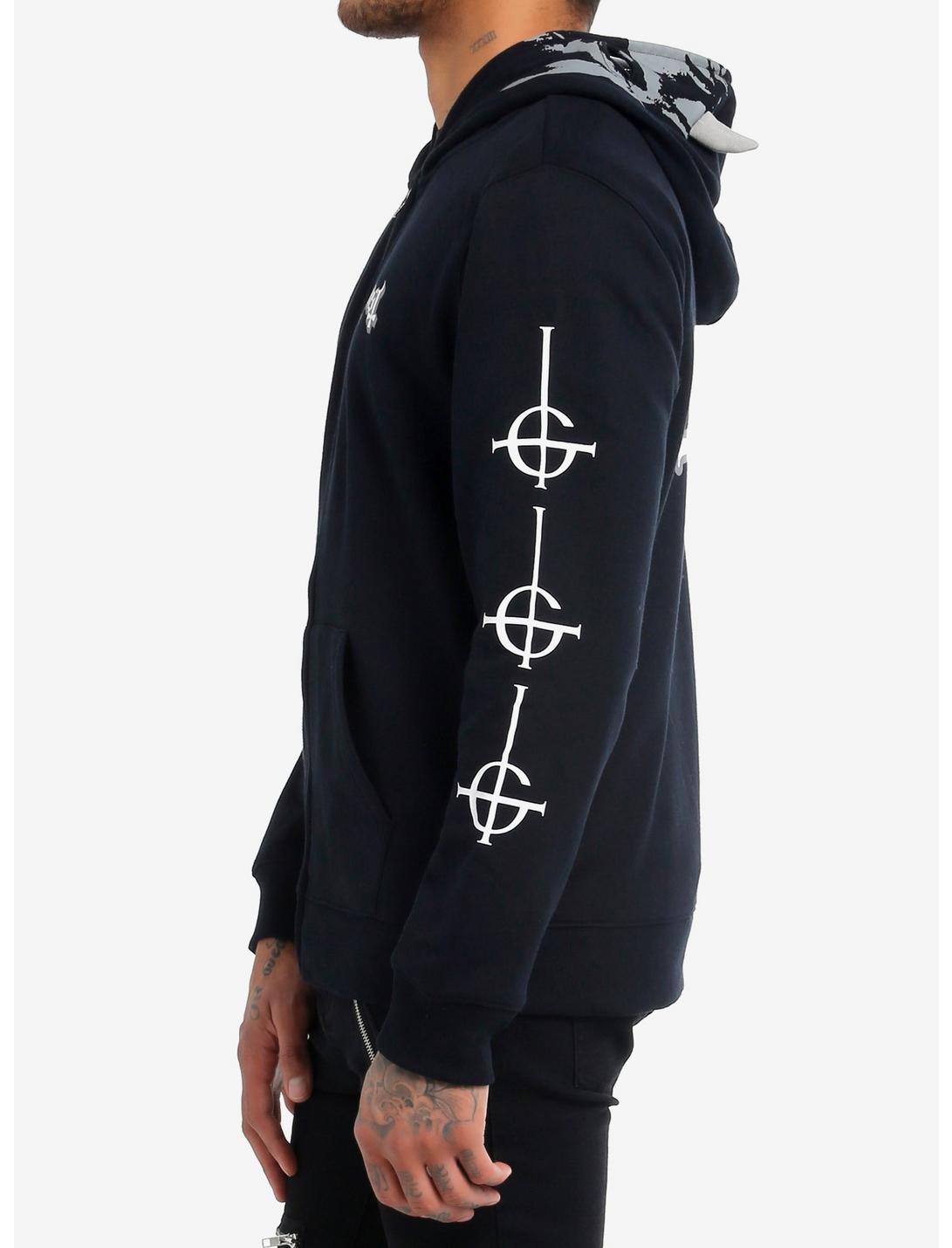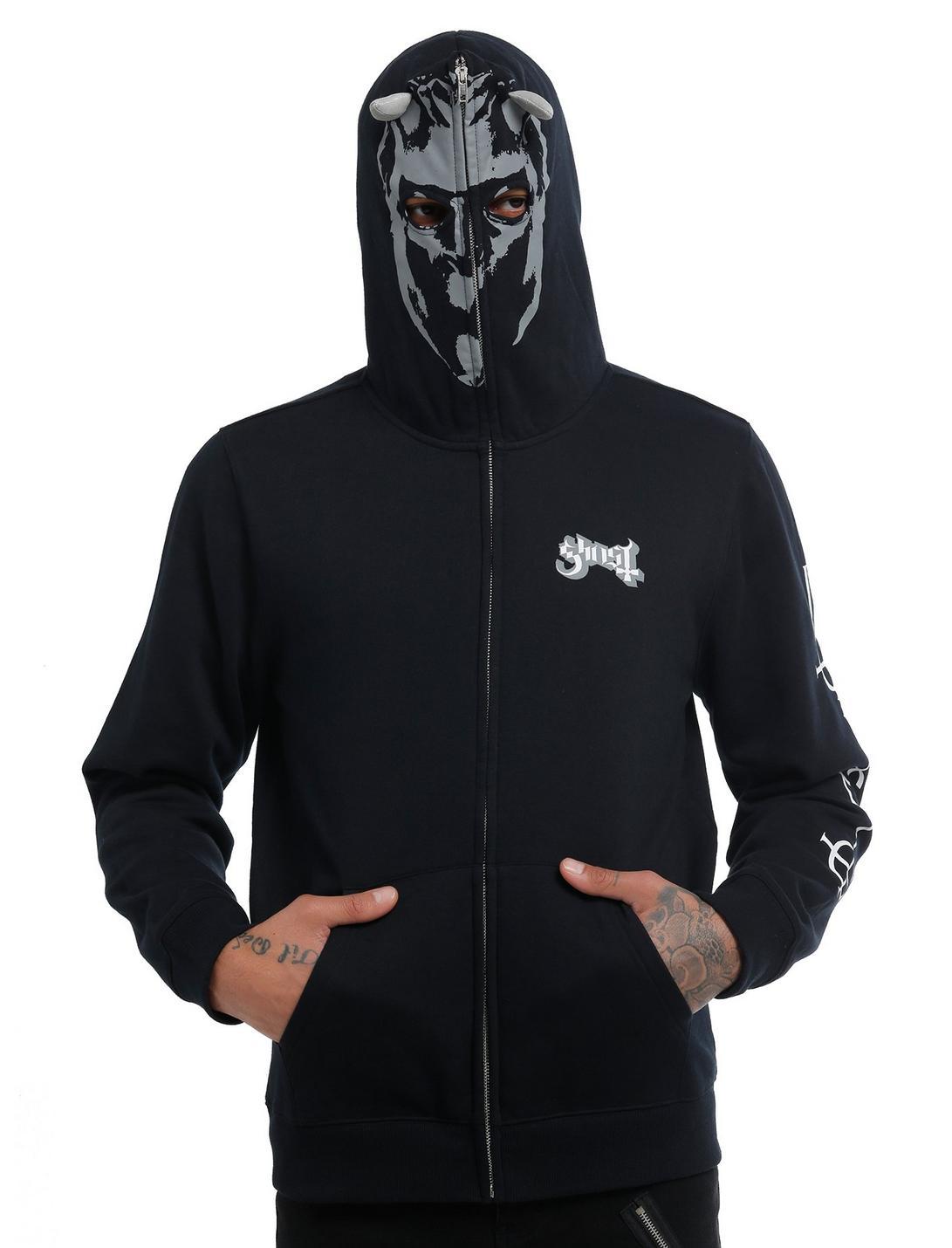 Slip into darkness with this Ghost hoodie that will make you feel like a ghoul! It zips all the way up to reveal a ghoul's face (with eye holes) printed on the it with 3D horns at the top. Ghost's band logo is on the front left chestm and there are grucifixes printed down one sleeve and on the back. Front pockets.60% cotton; 40% polyesterWash cold; dry lowImportedListed in men's/unisex sizesModel is 6'1"Model wears size Medium
