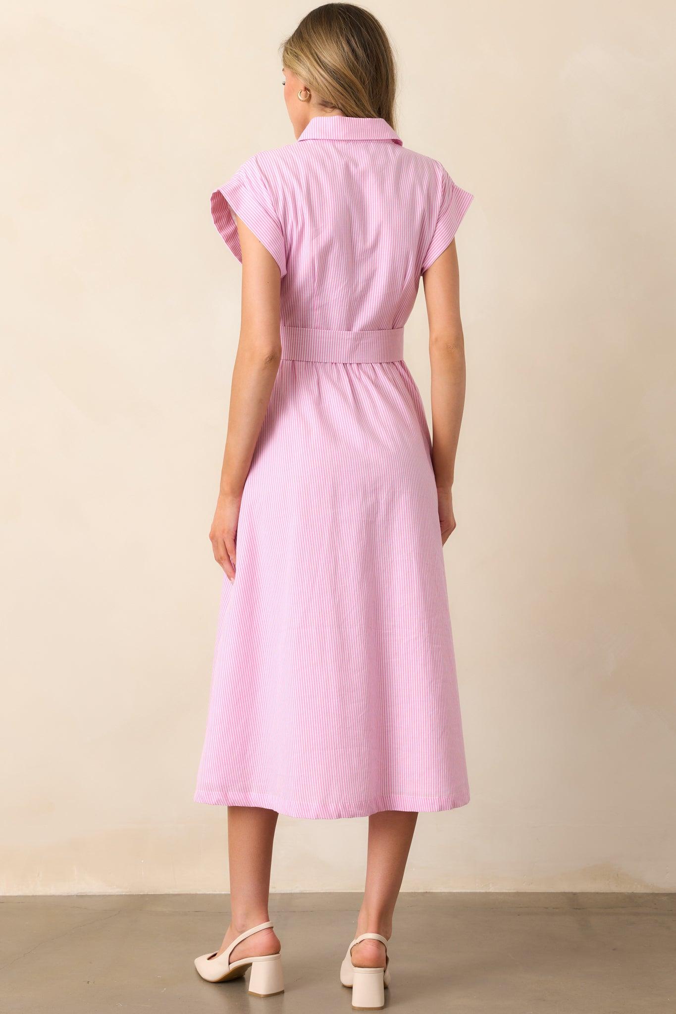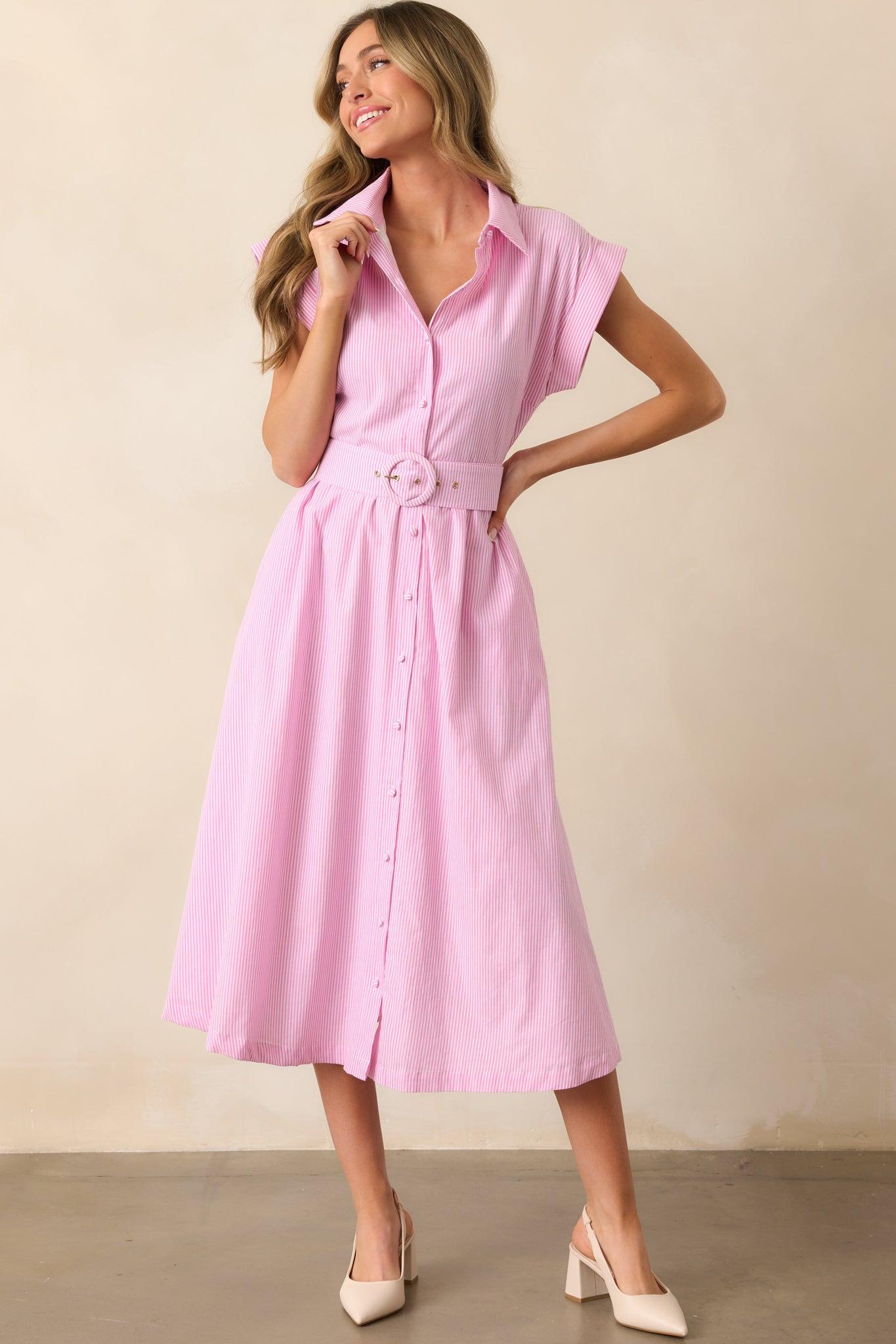 The Gia Peony Pink Stripe Belted Cotton Midi Dress is a perfect mix of classic charm and effortless elegance. Featuring soft pink stripes and a flattering belted waist, this midi dress is ideal for brunches, garden parties, or any occasion that calls for a fresh, feminine touch. This peony pink dress features a collared neckline, functional matching fabric button front, a matching fabric adjustable belt with a round buckle, cuffed short sleeves, and functional pockets. 100% Cotton Lined: 100% Cotton Wash inside out, with cold water on a gentle cycle Use mild detergent & avoid bleach Hand wash cold & air dry preferred Manufactured in China & Designed in The USA Model is 5'8" & is wearing an x-small