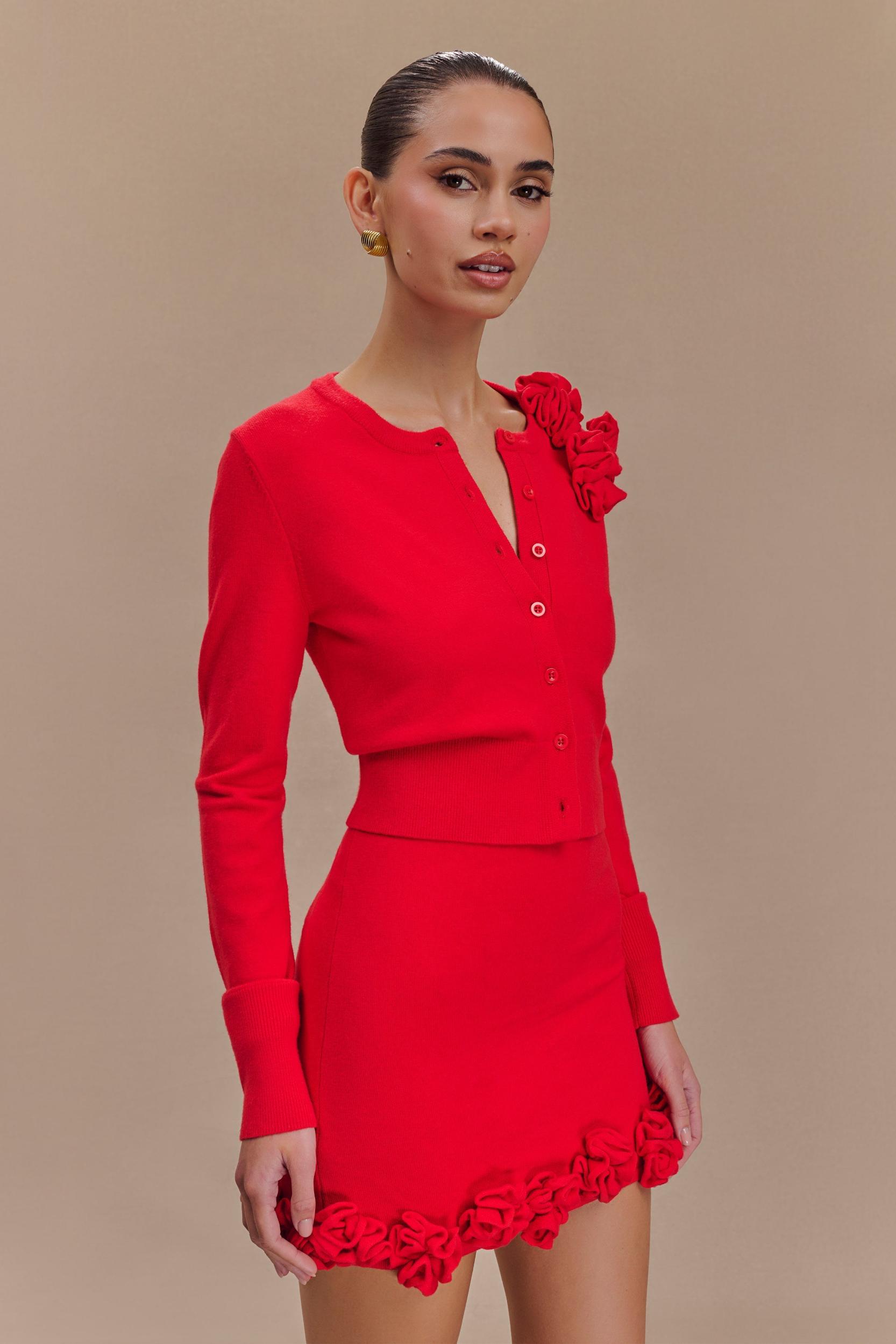 Petals of comfort. Embrace cosy elegance with the GIANNA Knit Cardigan with Flowers. This delightful piece features a classic crew neckline and a button front closure, making it easy to layer over any outfit. The ribbed waist provides a flattering fit, while the long, straight sleeves add a touch of sophistication. Adorned with beautiful flower details at the shoulder, this cardigan brings a playful yet refined element to your look. With its cropped length, this cardigan pairs perfectly with the Gianna Knit Mini Skirt with Flowers, effortlessly creating a coordinated ensemble for any occasion.