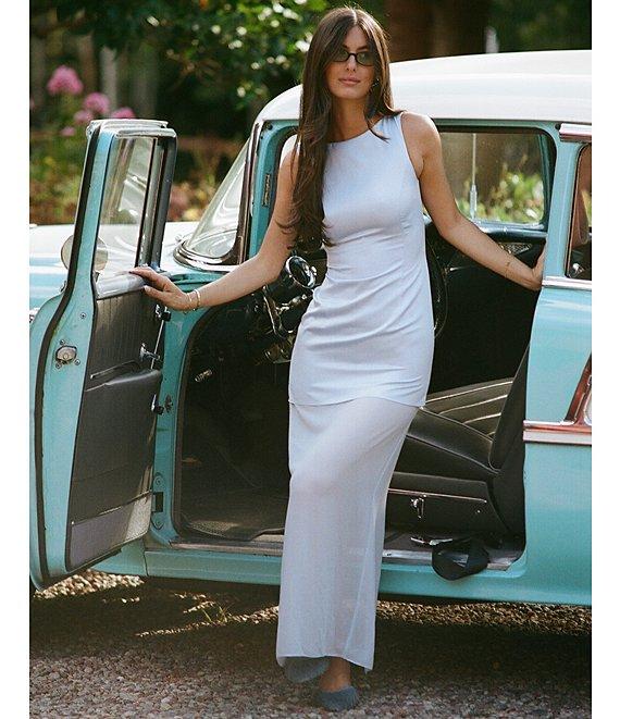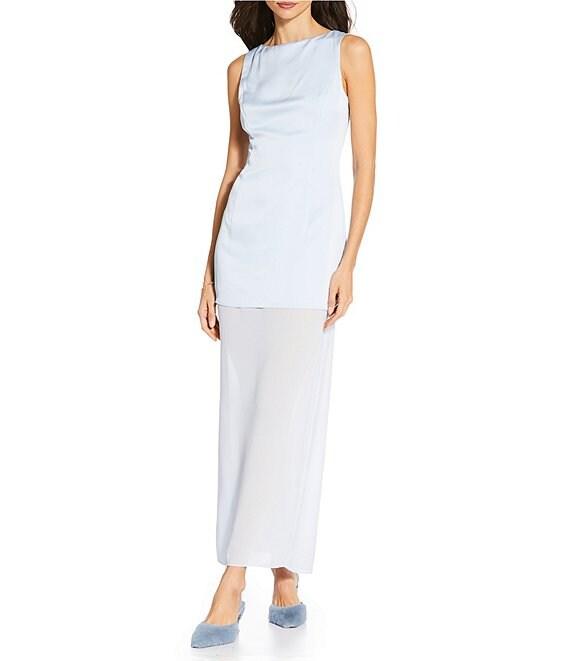 From Gianni Bini x Sydney Silverman, this dress features: Satin fabrication Drop waist silhouette Boat neckline Sleeveless Center back invisible zipper with hook & eye closure Contrast sheer chiffon in skirt Partially lined Approx. 29.5" in length Polyester Dry clean Imported. Dillard's Exclusive