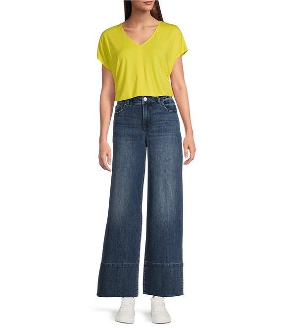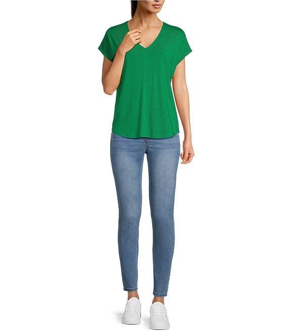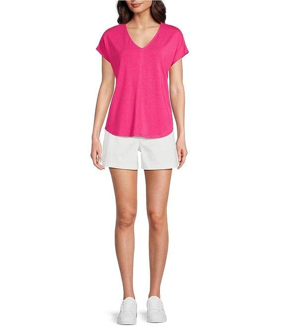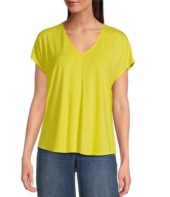 From Gibson & Latimer, this shirt features: Stretch knit fabrication V-neckline Dropped shoulder Short sleeves Pullover construction Center front seam detail Tee silhouette Classic fit High-low shirttail hemline Approx. 25.25" HPS in length Rayon/spandex Machine wash in cold cycle, wash with similar colors and fabrications, tumble dry on low, use cool iron as needed. Imported.