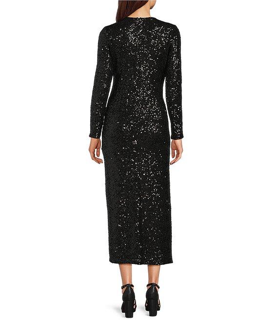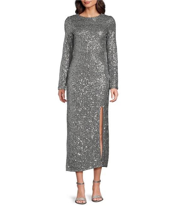From Gibson & Latimer, this dress features: Sequin fabrication Round neckline Long sleeves Bodycon silhouette Fitted Side split from thigh to hem Flounce hemline Maxi length Back keyhole with button closure Approx. 49.5" HPS in length Polyester Turn garment inside out prior to wash, machine wash on cold gentle cycle, wash with similar colors, tumble dry on lowest cycle, use cool iron on low if needed. Imported. Dillard's Exclusive.