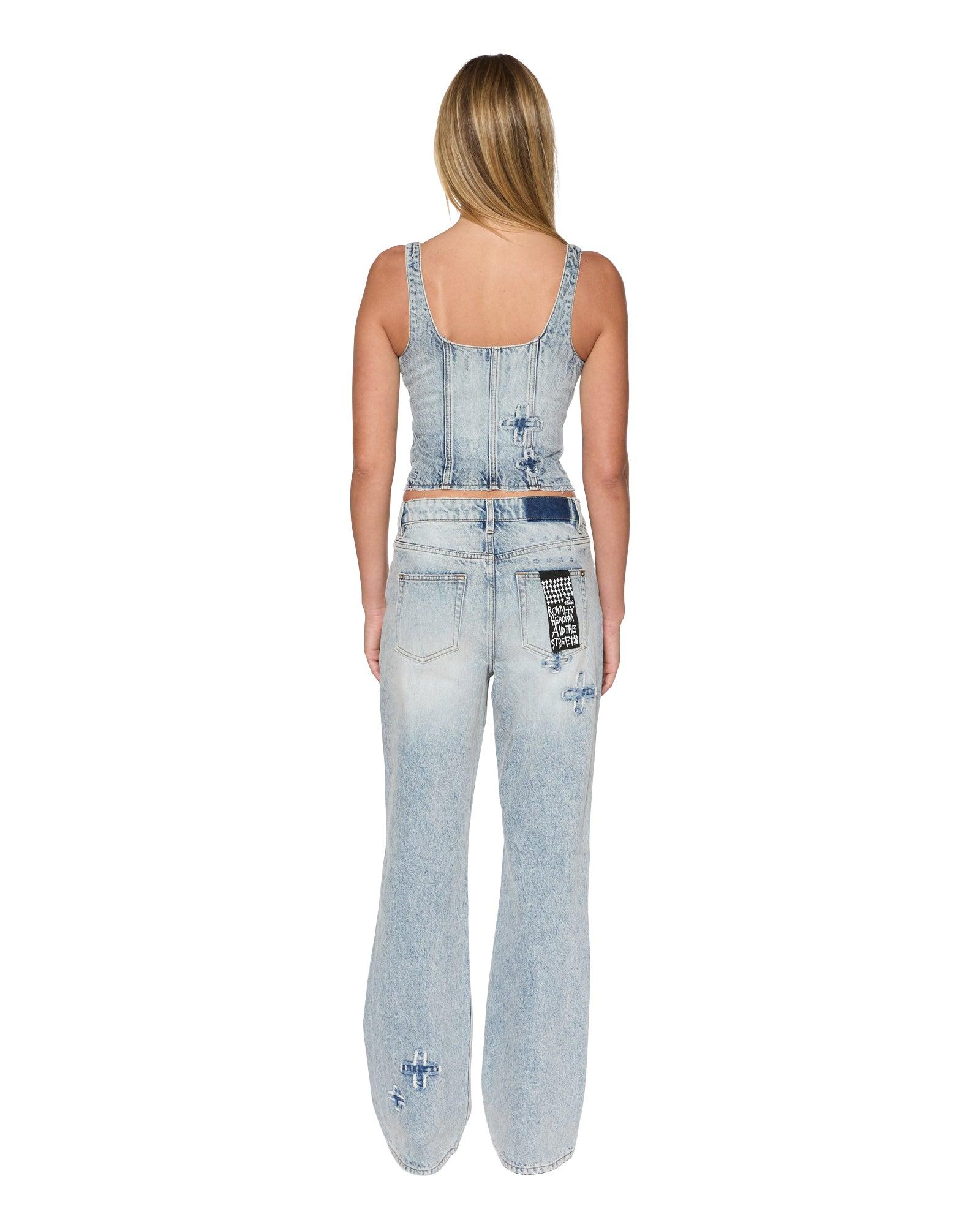 The Gigi Bustier in Klassic Kraftwerk is a fitted, soft square neck bustier with front panel seams, a centre front hook and eye detail, and a shaped hem. Made from premium rigid denim in indigo blue stonewash, it features Ksubi 'plus' applique denim patches on the front and back, and is designed with added length, making it the perfect match for the Soho Slouch Klassic Kraftwerk for a complete look.