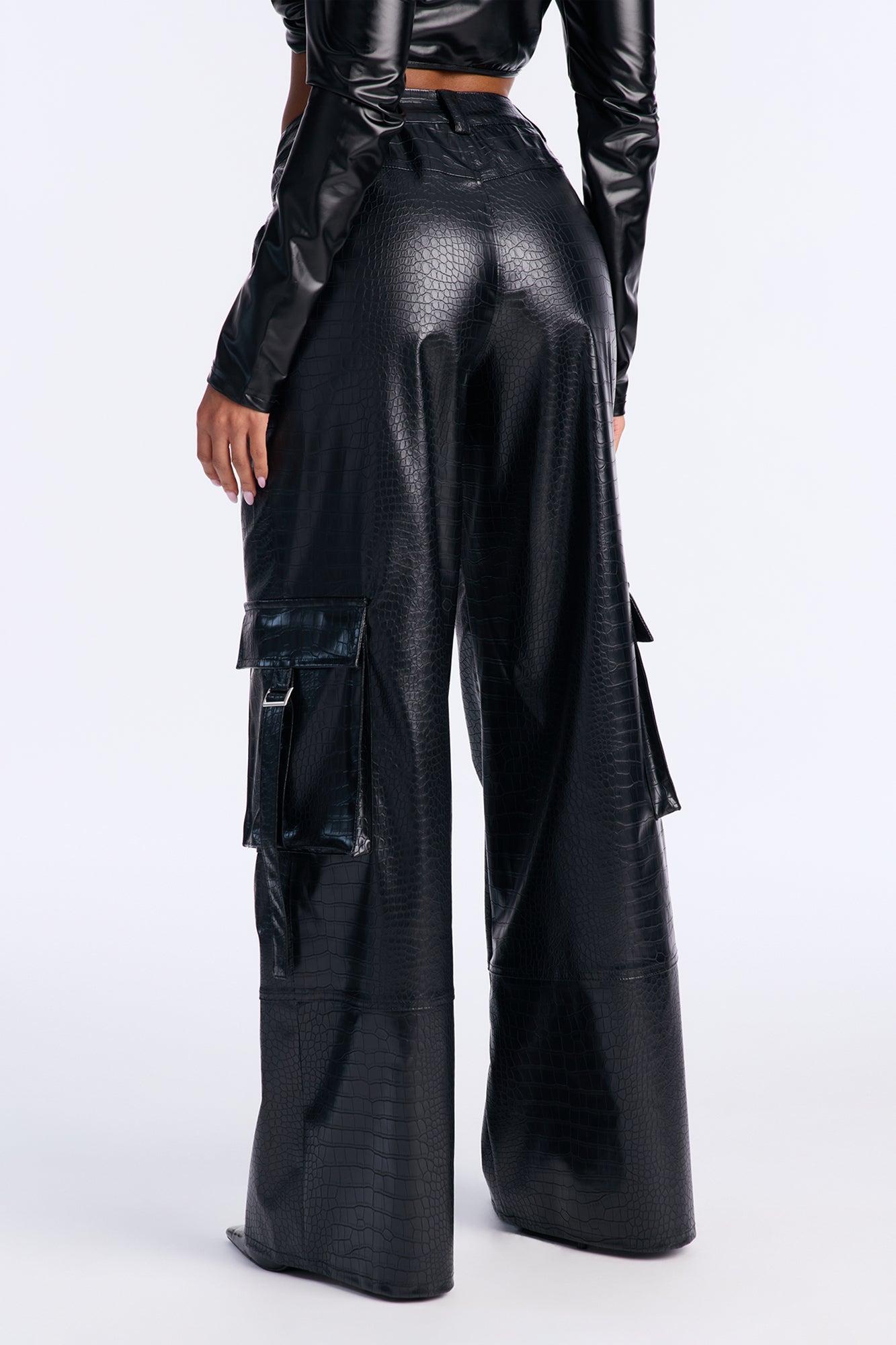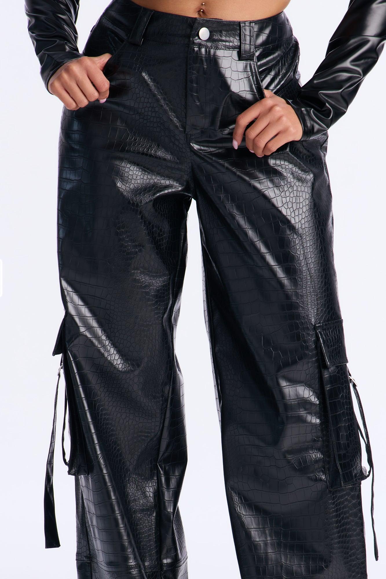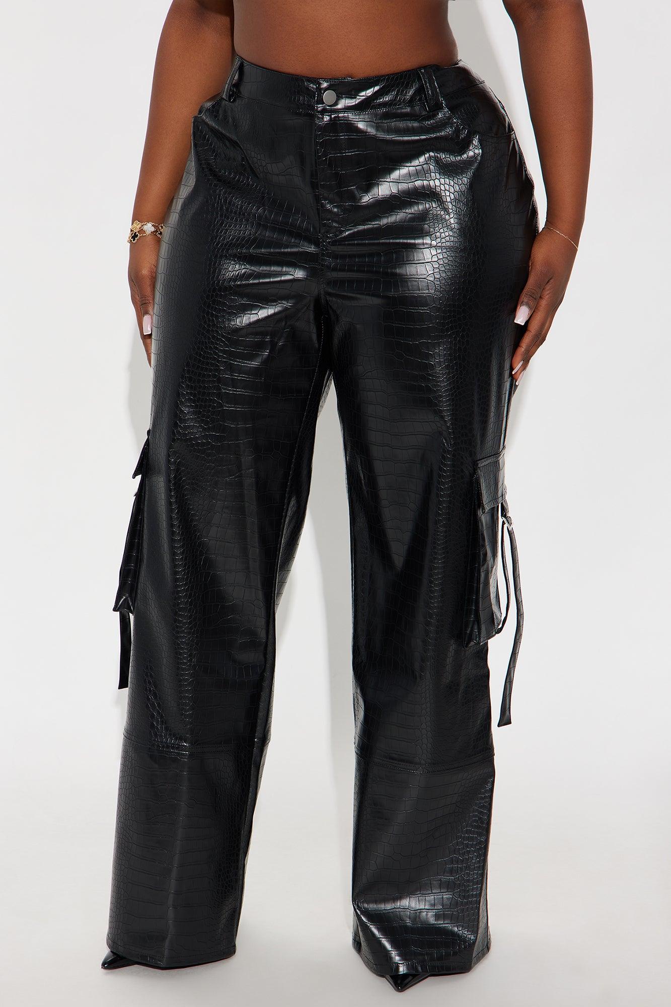 Available In Black And Blue. Wide Leg Pant Button And Zip Closure Low Rise Faux Leather 32" Inseam Cargo Pockets Non Stretch Self : 50% Polyurethane 50% Polyester Lining : 100% Polyester Imported California Proposition 65WARNING: Cancer and Reproductive Harm - www.P65Warnings.ca.gov.