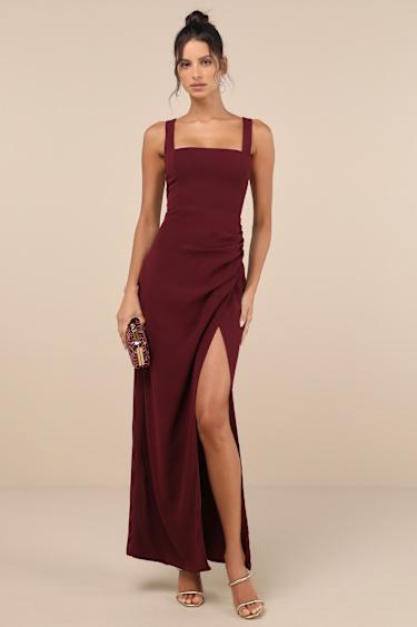 If you always reach for the most elegant option, you need the Lulus Glamorous Disposition Burgundy Ruched Maxi Dress! Lightweight woven chiffon shapes this sophisticated dress that has a seamed bodice with slender straps and a square neckline. High, fitted waist tops a chic skirt that has strategic side ruching and an overlapping design that creates a flirty front slit, ending at a maxi hem. Hidden zipper/clasp at back.