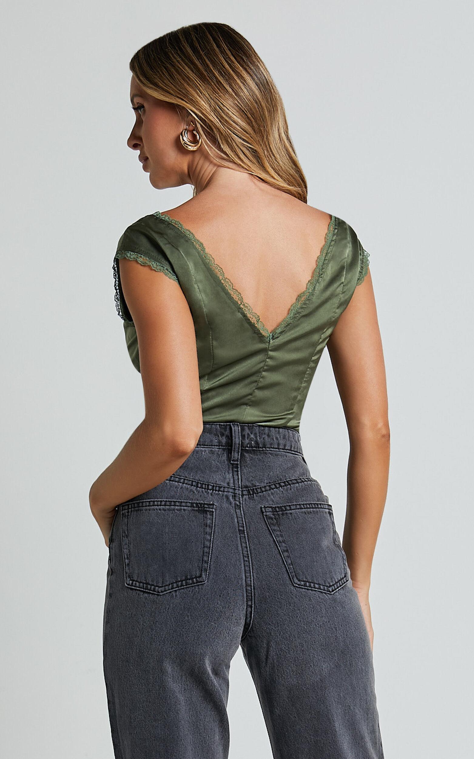 Crafted in a dreamy sage green hue, this top features a flattering V-neckline trimmed with delicate lace detailing and sweet cap sleeves, ideal for brunch dates or girls' nights out.Pair the Gloria Top casually with baggy jeans for an effortlessly cool look, or lean into a ballerina-inspired aesthetic by styling it with a flowy midi skirt and heeled thong sandals. Whether you're feeling laid-back or ready to dazzle, this versatile piece will quickly become your new favorite wardrobe staple.Product Details:Zips featureSatin fabricPlunge necklineCasual wearStandard lengthShort sleevesPolyester material