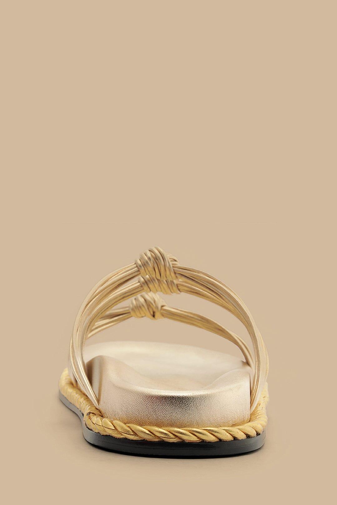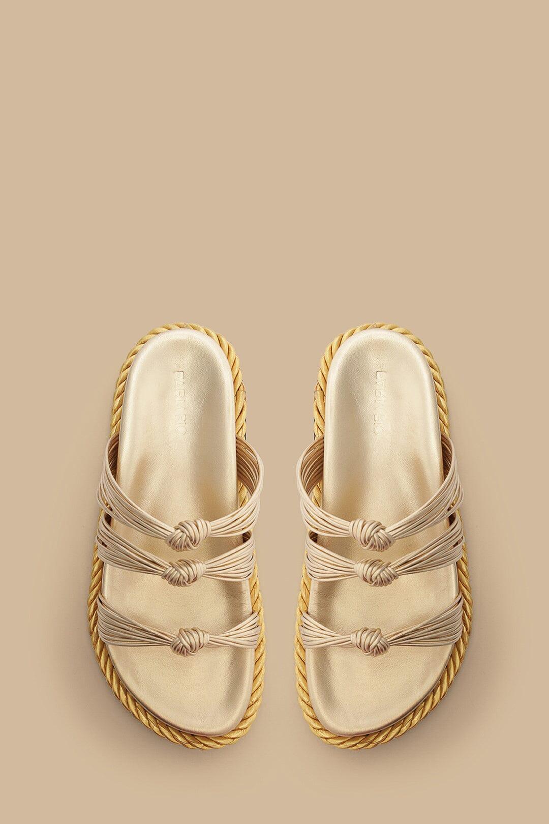 Step into playful elegance with the Gold Knot Slide Sandal by FARM Rio. Brilliant gold tones intertwine in an intricate knot design, melding artistry with comfort. Crafted from responsible materials, its beautiful embroidery evokes a sense of warmth and familiarity. The gentle curves and woven details make it a standout piece, perfect for adding a touch of sophistication and charm to any ensemble. Composition Leather Upper & Sole