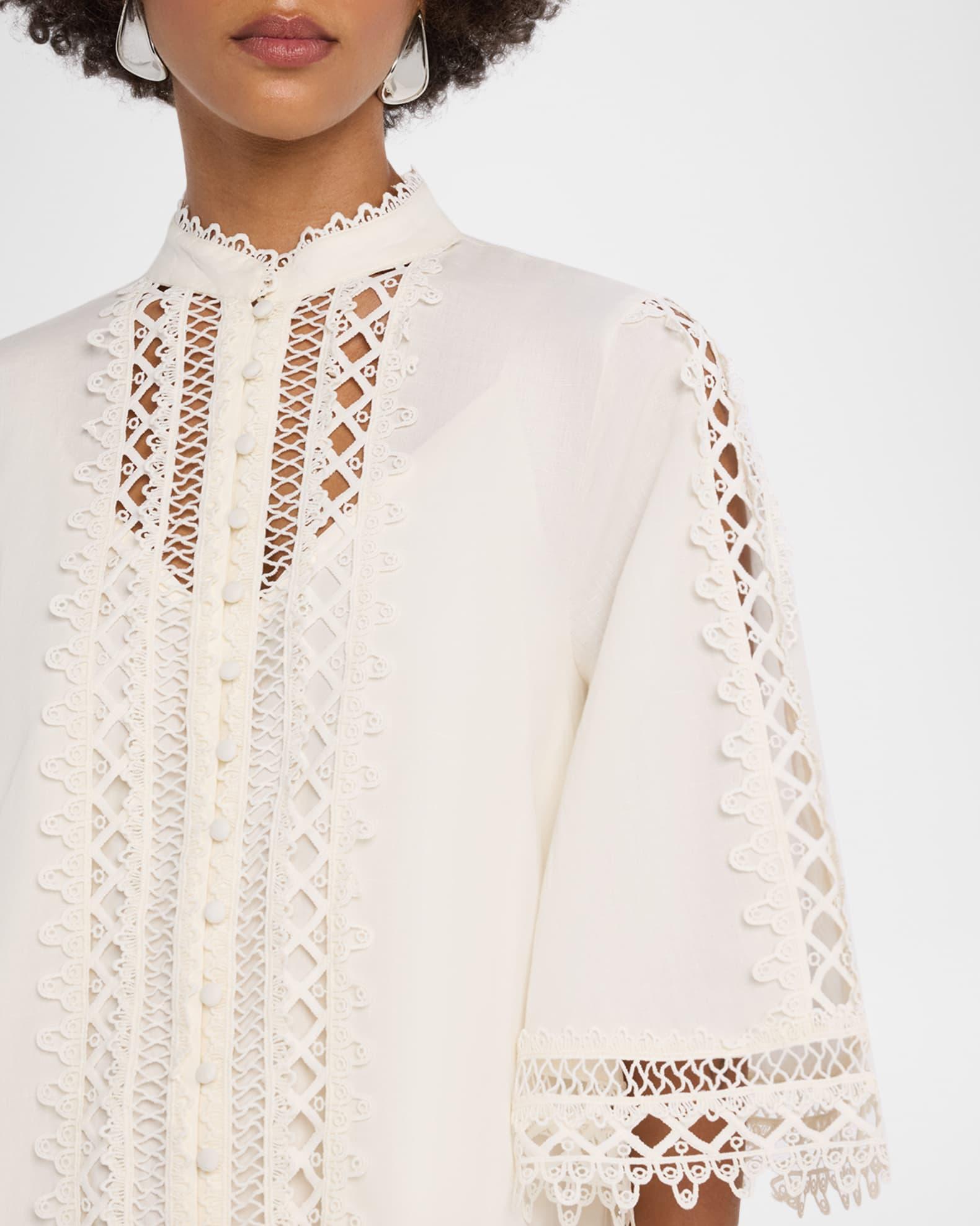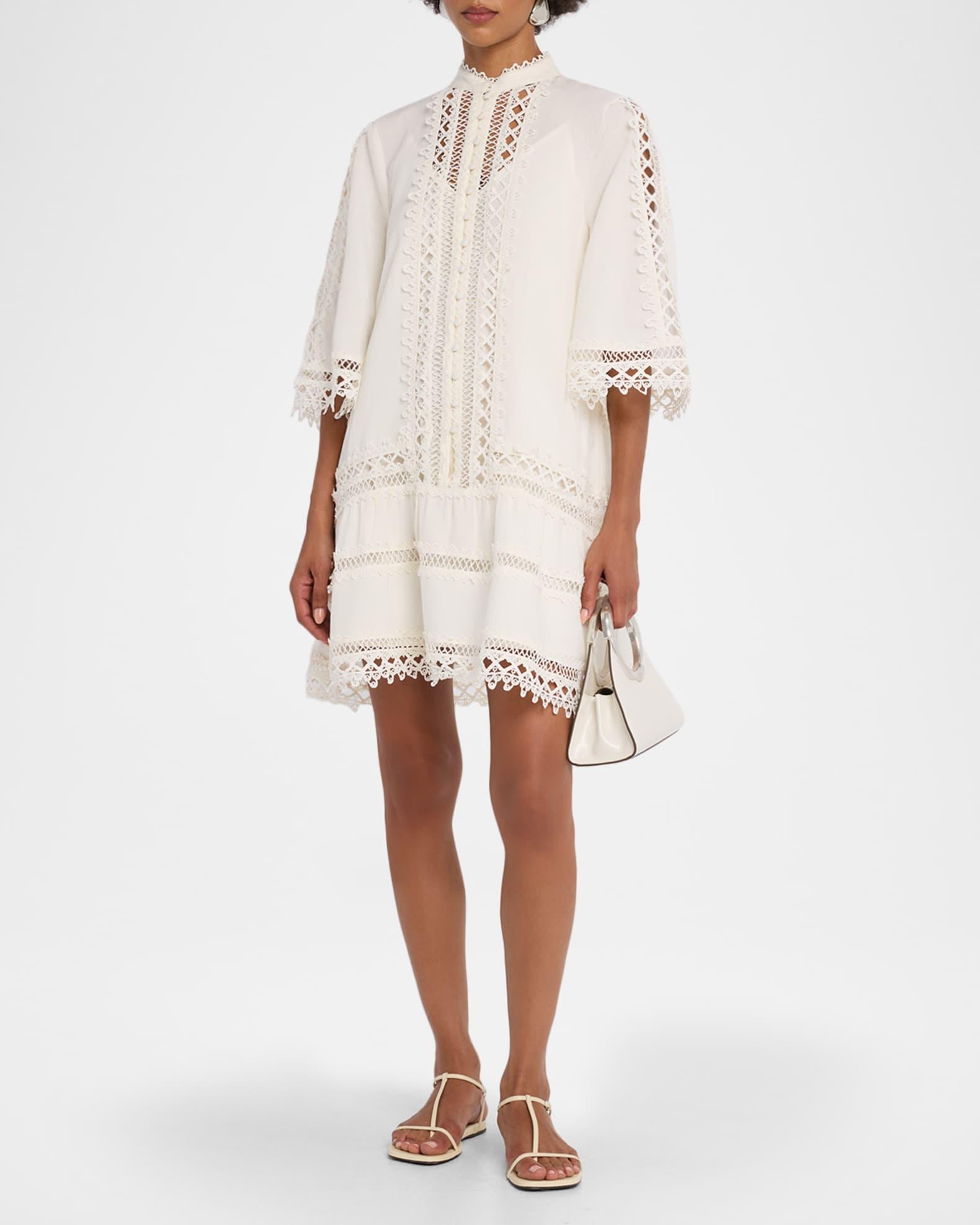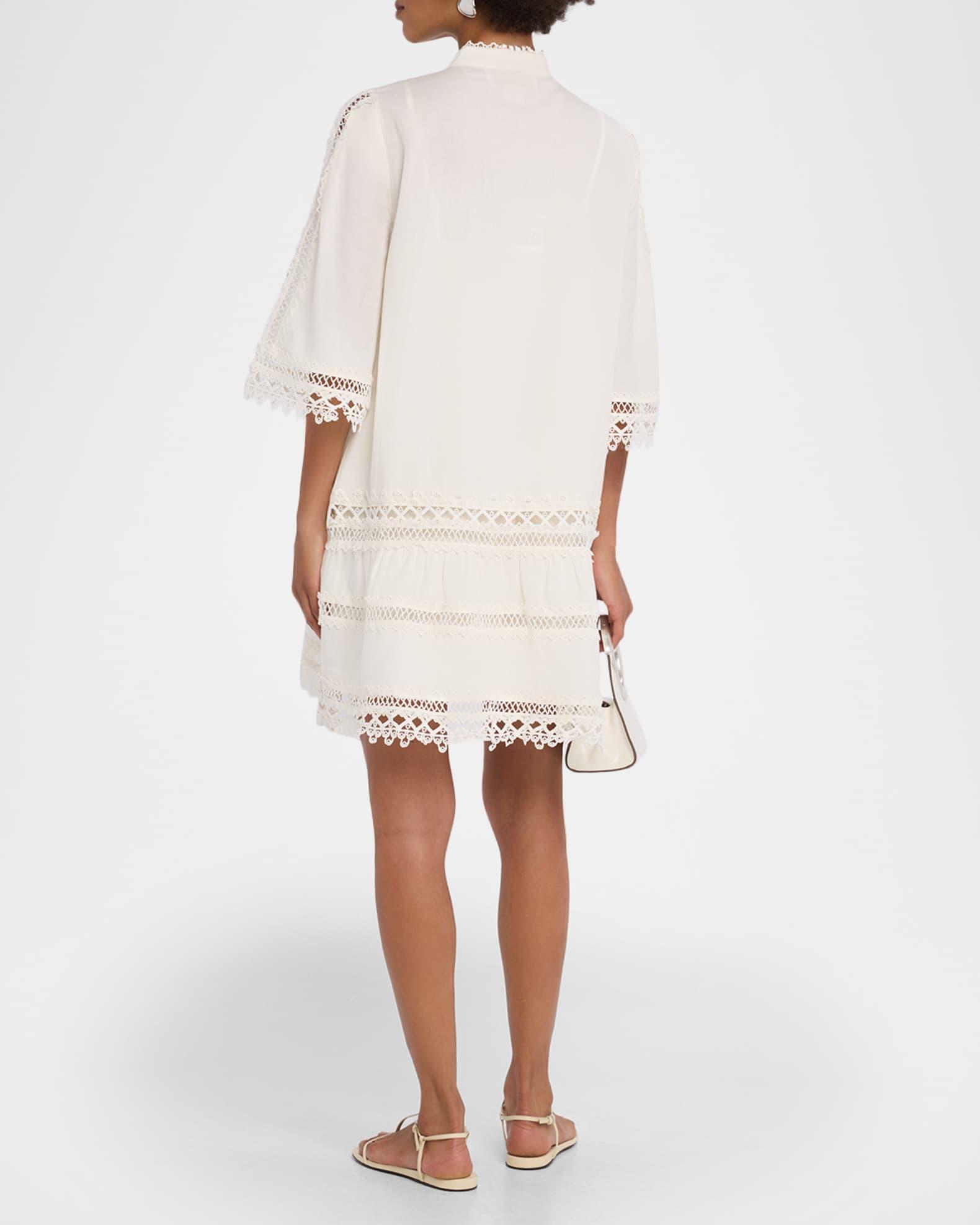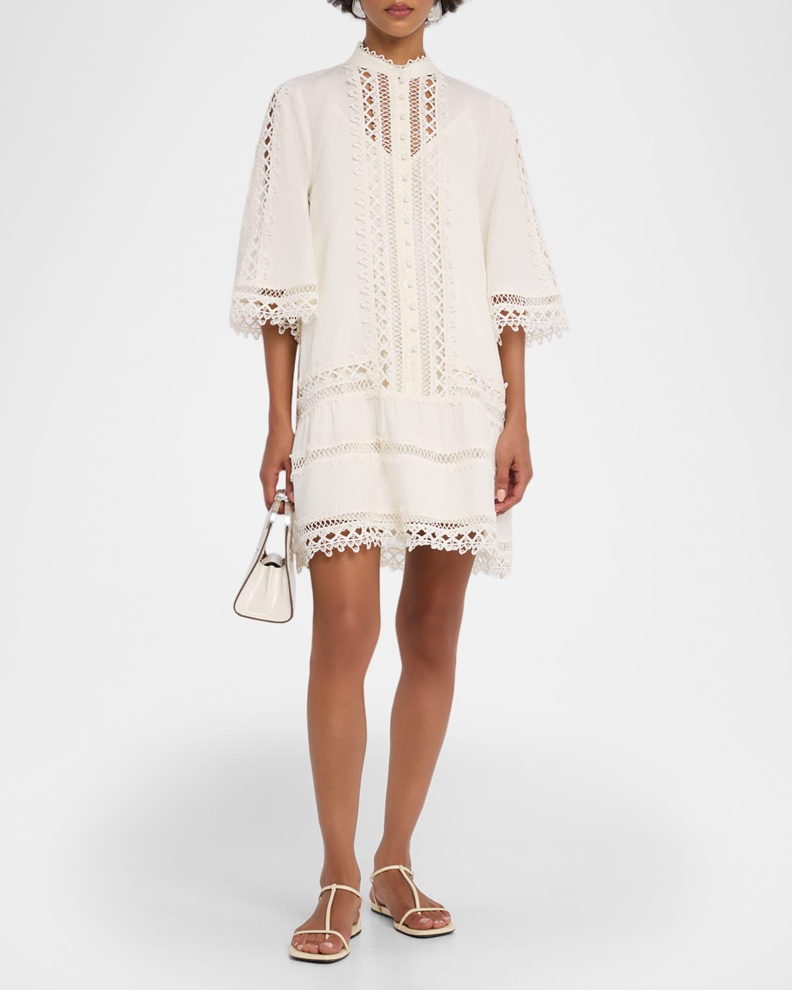 Mestiza New York "Goldie" mini dress in a lightweight cotton-linen blend, trimmed in textural lattice lace Approx. 34.5"L from shoulders to hem Band collar; button front 3/4 sleeves Flounce ruffle hem Hem falls above the knee Shift silhouette Cotton/linen Machine wash cold Imported