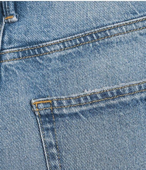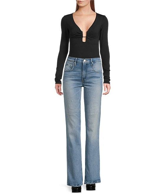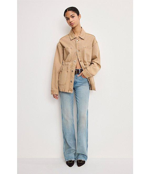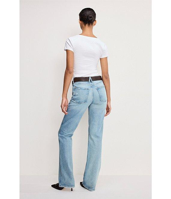 From Good American, these jeans feature: Comfort denim fabrication High-rise waistline Classic bootleg silhouette Button front/zipper fly closure Classic 5-pocket styling Full length Approx. 33.5" inseam, 18" leg opening, 10.5" rise Cotton/recycled cotton/lycra Machine was inside out/tumble dry low Imported.