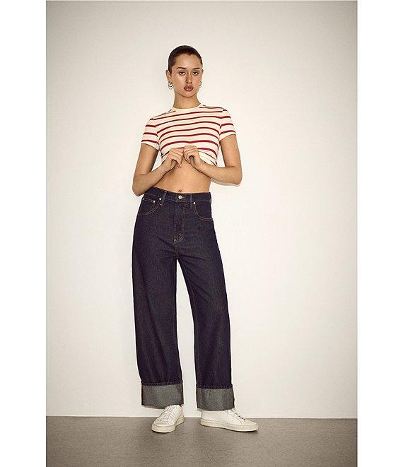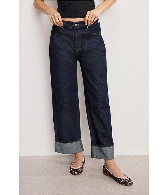 From Good American, these jeans feature: Rigid denim fabrication Dark blue wash Low rise waistline Button front/zipper fly closure Relaxed-baggy silhouette Cuffed hem detail Belt loop detail Classic 5 pocket styling Full length Approx. 30.5" inseam, 11.75" rise, 21" leg opening Cotton/cotton lyocell Machine wash inside out/ tumble dry Imported.