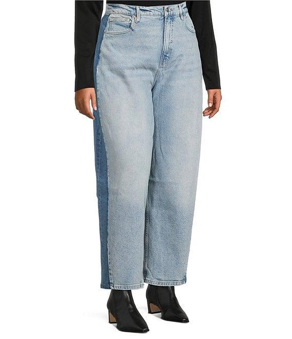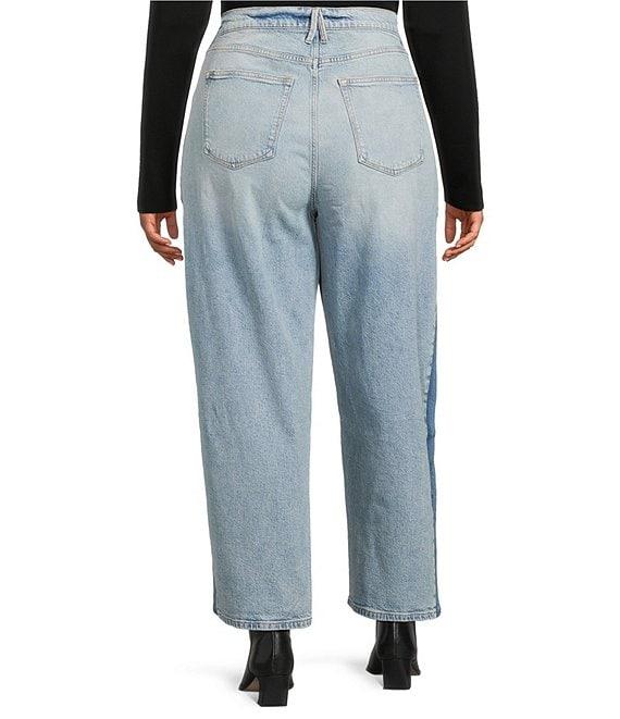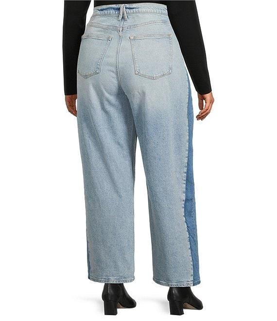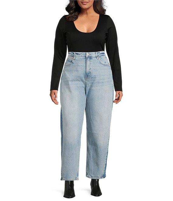 From Good American Plus, these jeans feature: Denim fabrication High-rise waistline Button zip fly closure Classic 5 pocket silhouette Effortless fit Barrel Leg - Exaggerated curved leg Approx. 28" inseam Cotton/ Tencel/ Elastane Machine wash, tumble dry Imported.