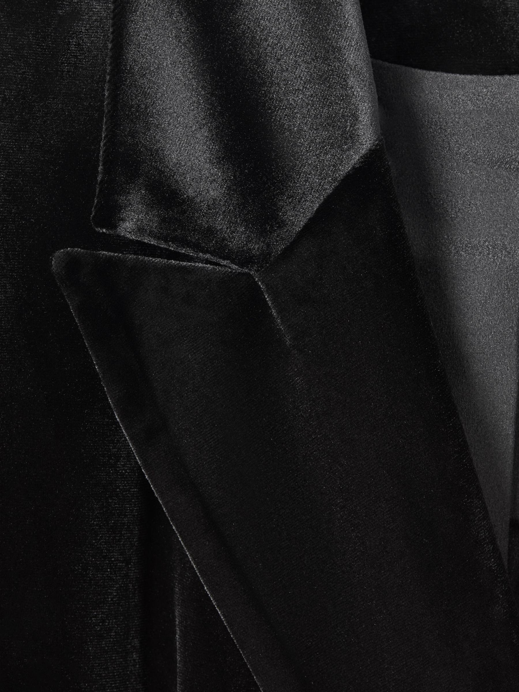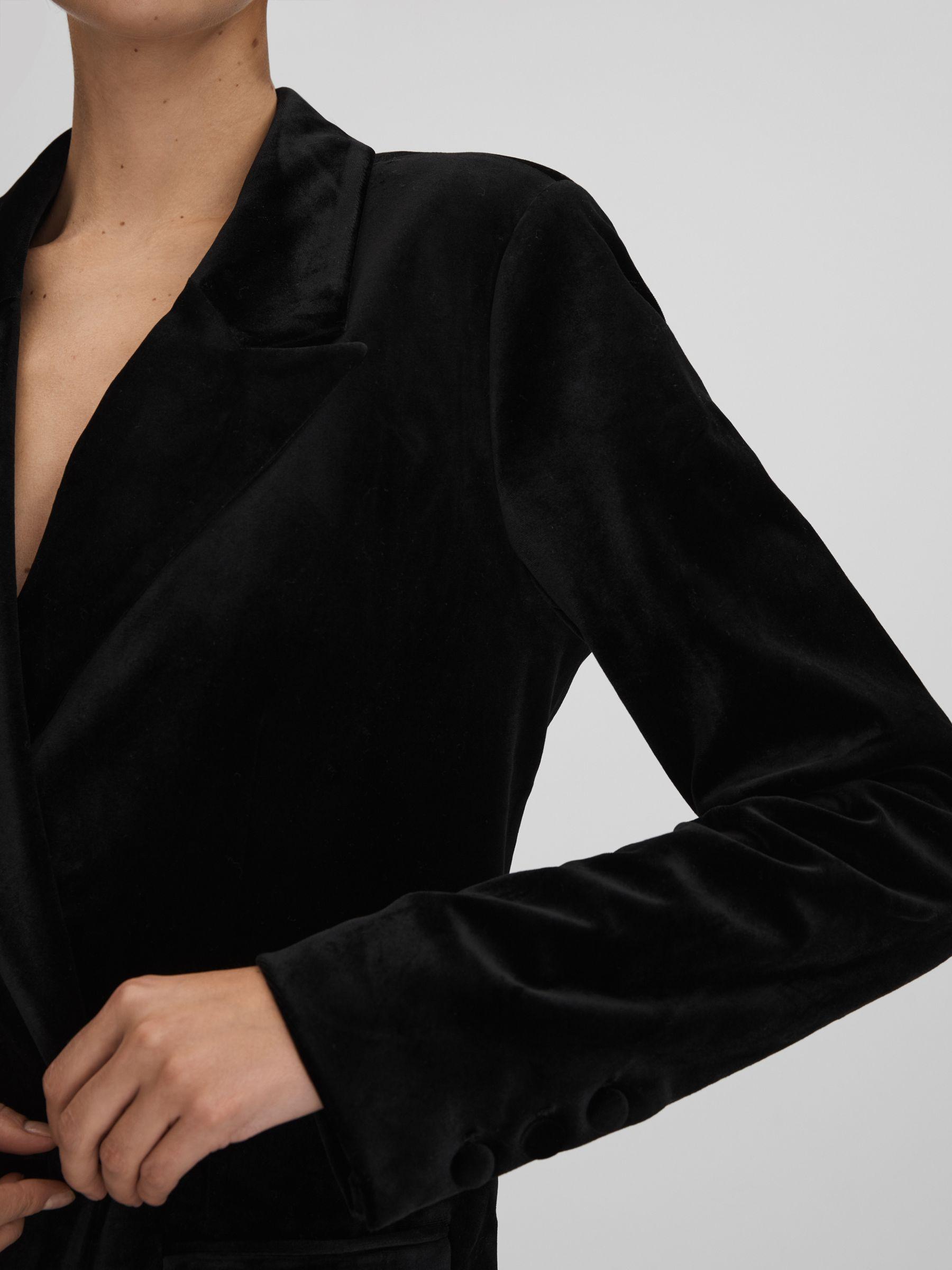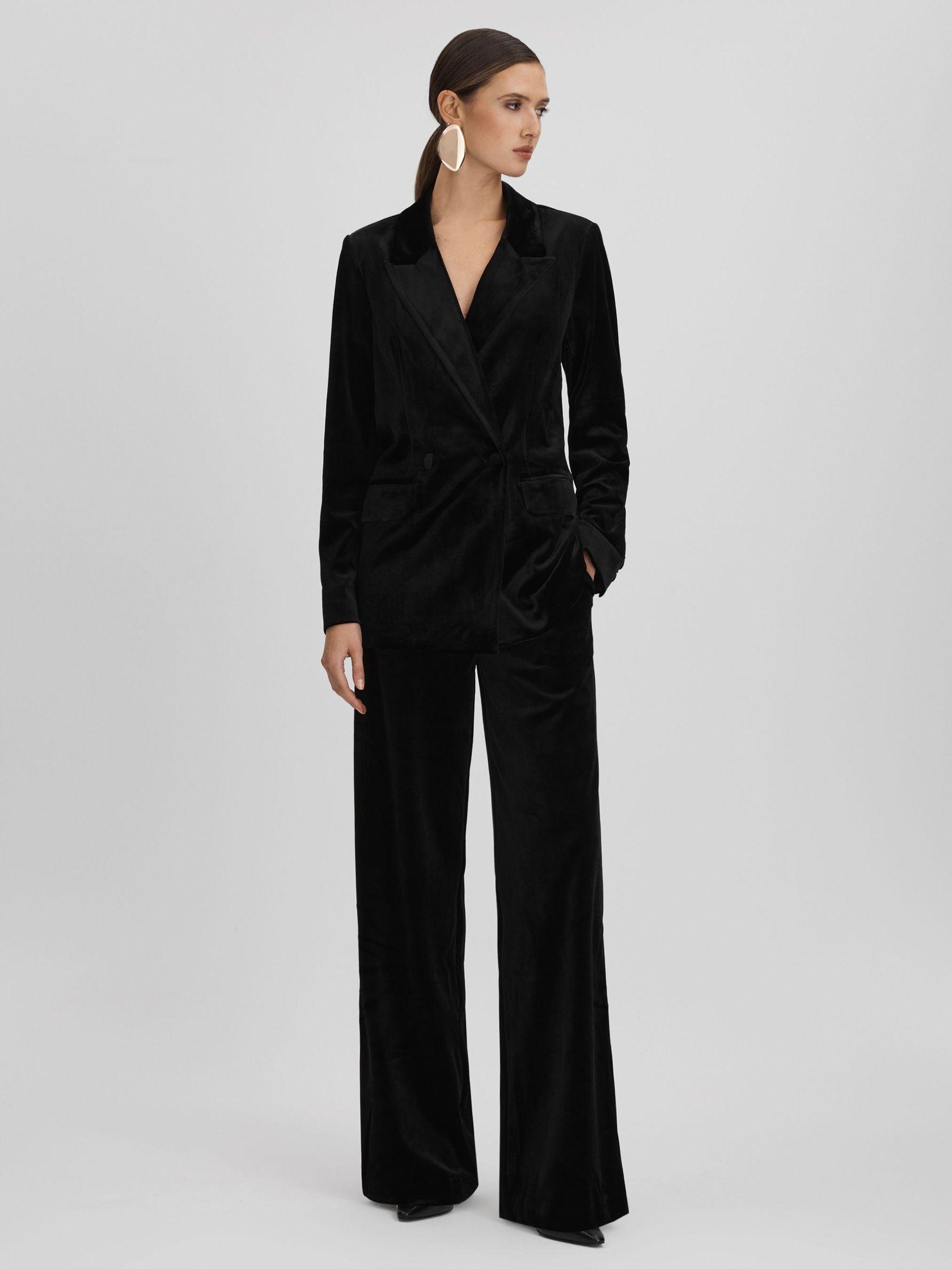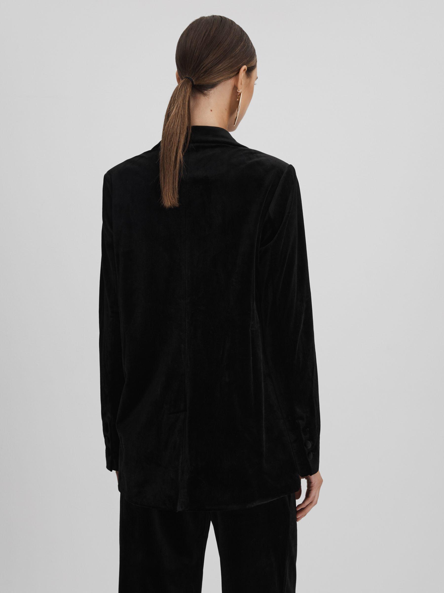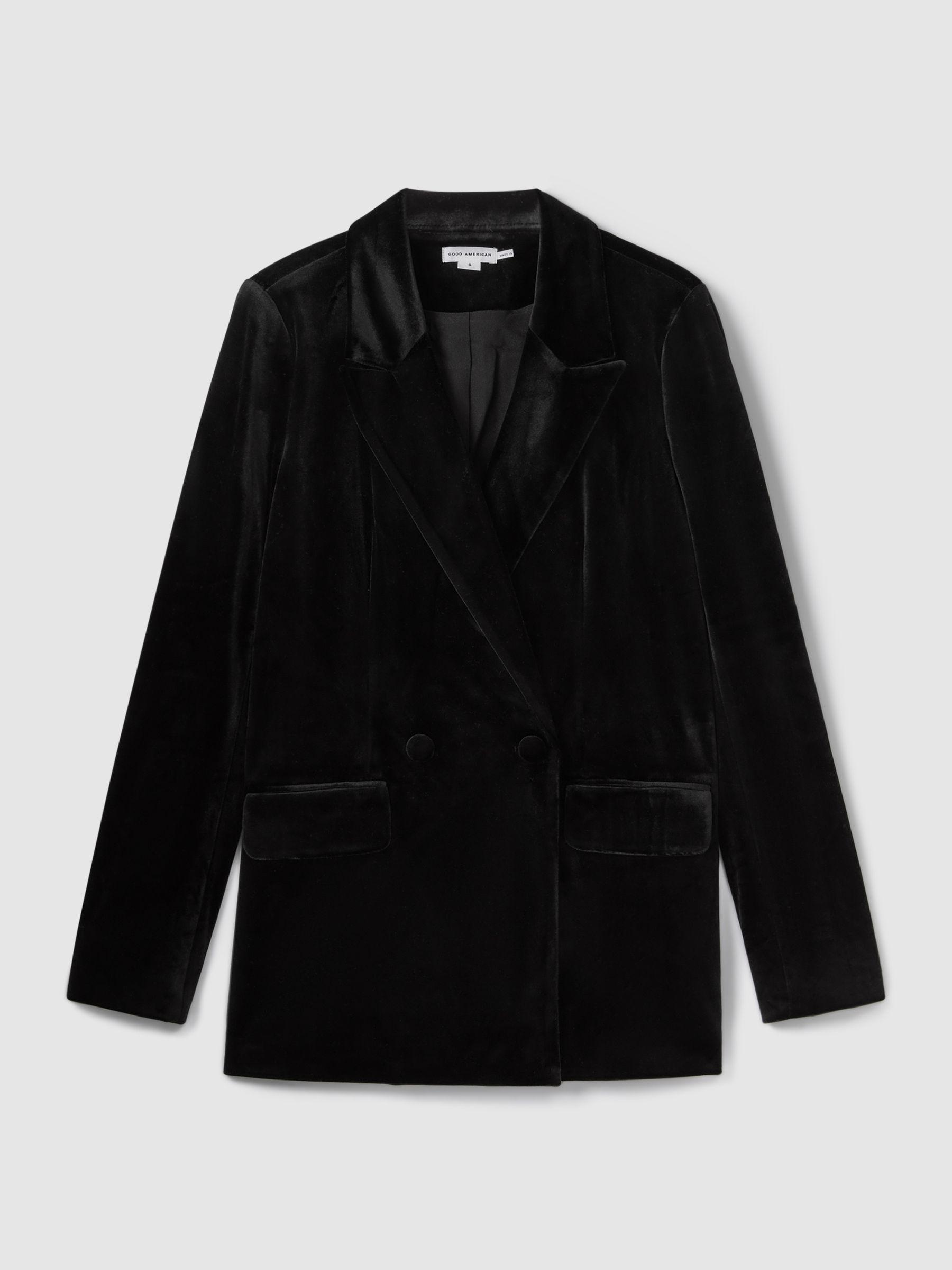 An ultra-plush velvet fabric is cut into a double-breasted shape with two buttons, flap pockets, and soft padded shoulders. Matching trousers Velvet fabrication Double breasted Flap pockets Lined Vent to reverse Good American, curated by Reiss, is a collection designed to work perfectly with your existing Reiss wardrobe. Innovative, solution-led denim and lifestyle garments champion inclusivity, enhance curves and represent body acceptance. By women, for women.