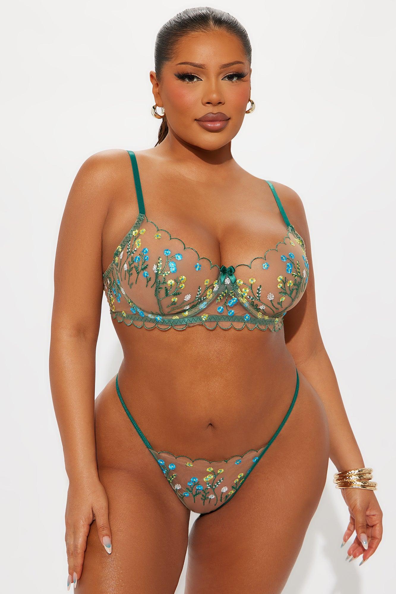 Available In Green. 2 Piece Set Underwire Bra Unlined Bra Cups Adjustable Straps Embroidered Detail Matching G String Final Sale 90% Polyester 10% Spandex Imported